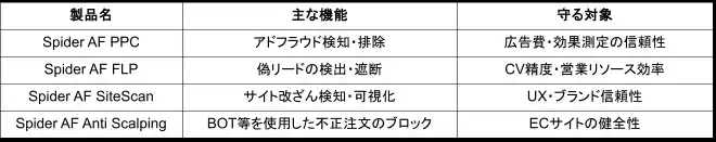 Spider Labsが提供する各ソリューションは、不正やリスクからマーケティング成果を守ることに特化したセキュリティ製品です。 |