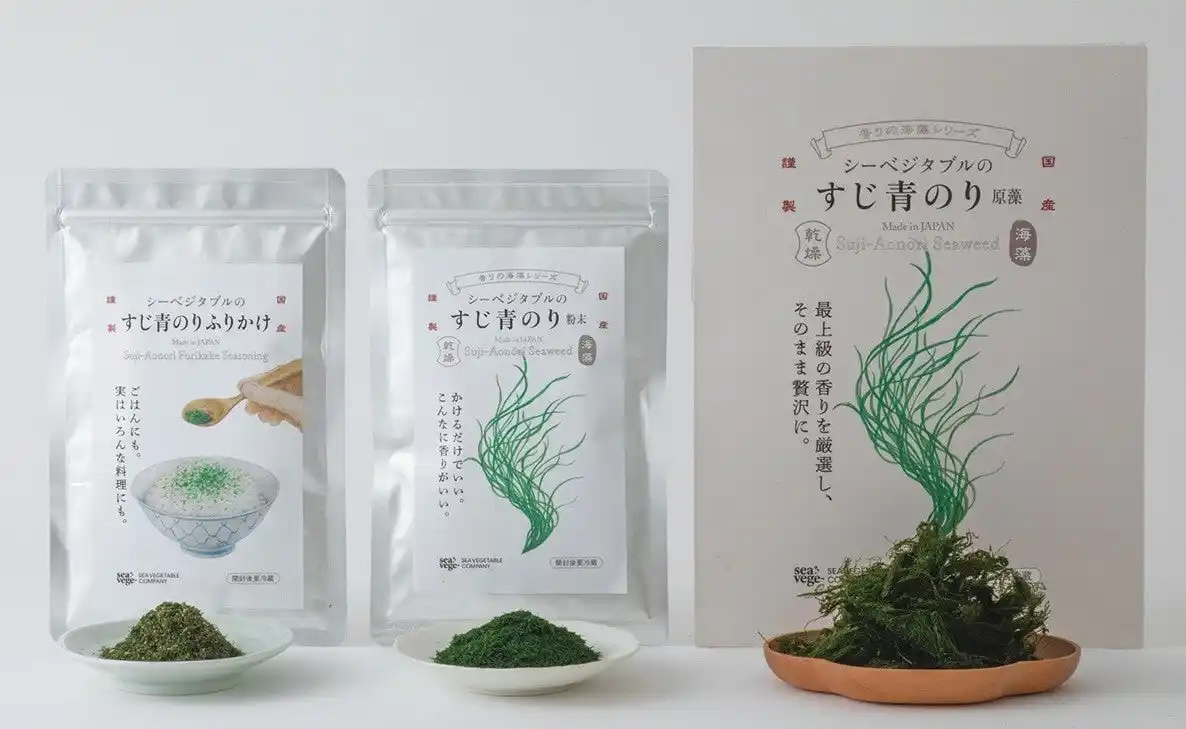 左から)シーベジタブルのすじ青のりふりかけ、シーベジタブルのすじ青のり(粉末)、シーベジタブルのすじ青のり(原藻) |