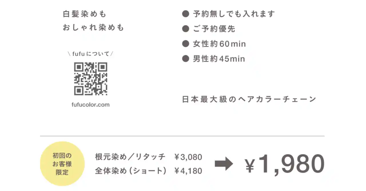 ヘアカラー専門店fufuは、全店直営で140店舗以上展開。累計400万人超のお客さまにご利用頂いております。 価格のみならず予約なしでも来店可能でシャンプー完了まで60分という手軽さはもちろん、「キレイな髪で、毎日をにこやかに。」というコンセプトのもと「プロによるクオリティの高い施術」「発色が良くダメージの少ない高品質なカラー剤」「ヘアケアに特化したオリジナル高品質シャンプー・トリートメント」など、リーズナブルな価格を実現しながらも妥協のないサービスを提供しております。 |
