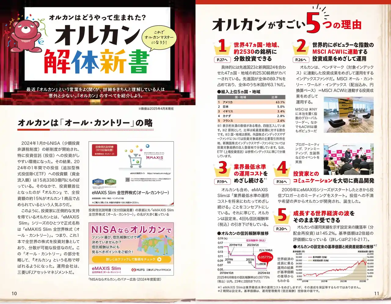 | 投資用語の解説や制度の基礎知識はもちろん、運用のプロフェッショナルによる対談や、ファンドマネジャーの1日を追う企画も収録。オルカンが誕生した背景や支持される理由を深掘りしています。 | |||||||