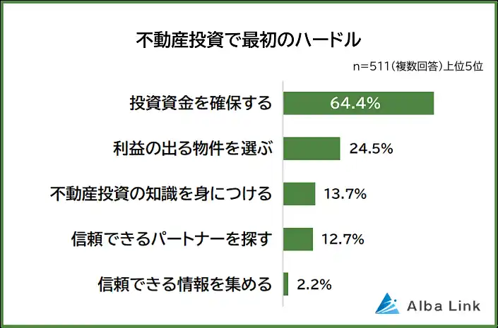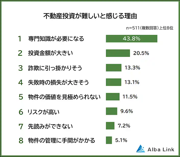 株式会社AlbaLink(本社:東京都江東区、代表取締役:河田 憲二)は、全国の男女511人を対象に「不動産投資が難しいと感じる理由に関する意識調査」を実施し、そのデータをランキングにしました。
