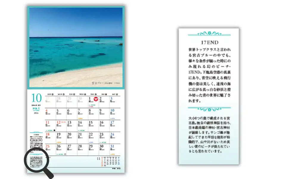 | 美しい沖縄のブルー絶景。聖地ごとの伝説をワンポイントで解説して毎月めくるのが楽しみになります。コンパクトな壁掛けタイプでちょっとしたメモ書きにも重宝します。六曜、旧暦、一粒万倍日を記載しています。 | |||