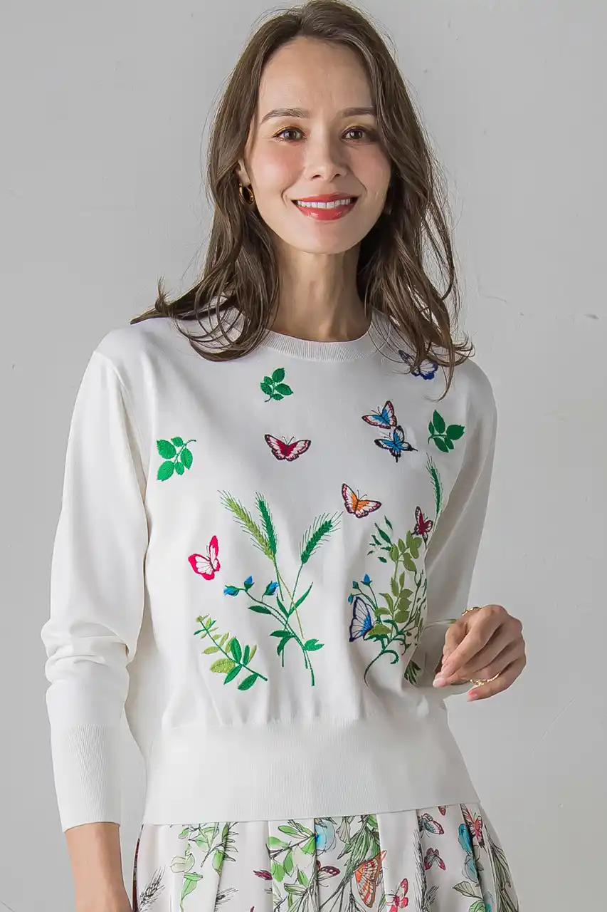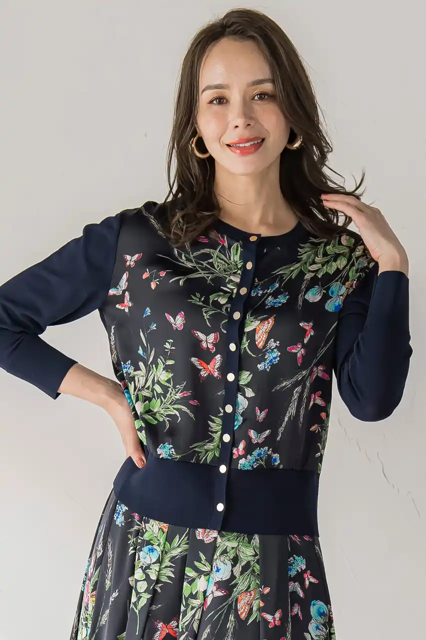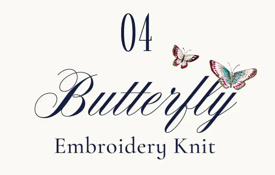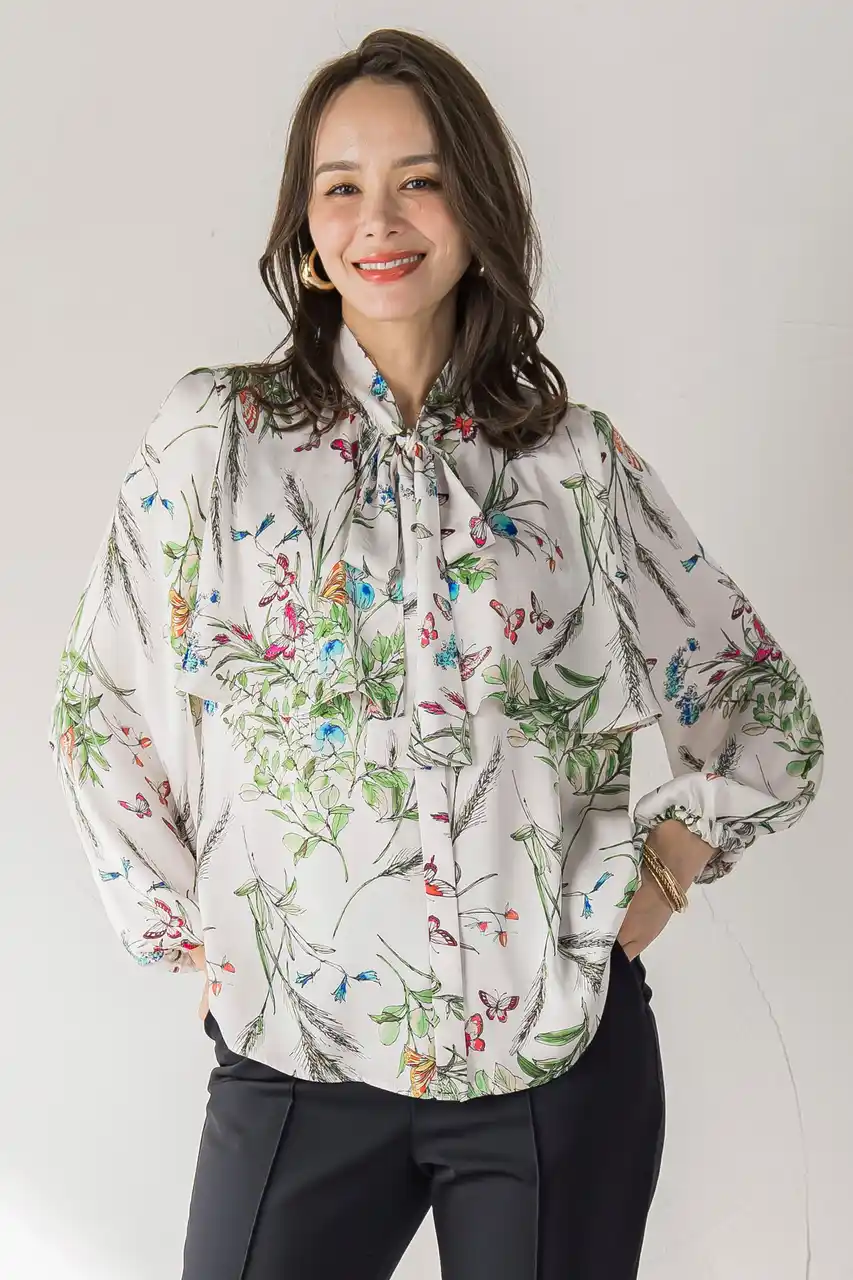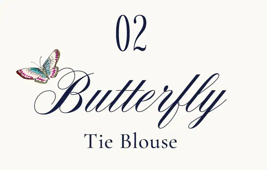京都のアトリエでビアッジョブルーのためだけに、手書きで描かれた繊細なバラフライ柄が、 落ち着いた秋の装いにそっと華やぎを添えます。 大人の女性にふさわしい、アートのような一着です。 |