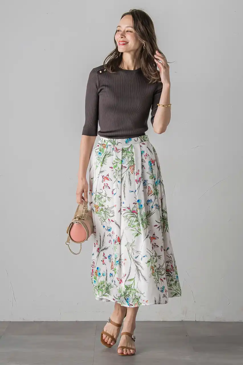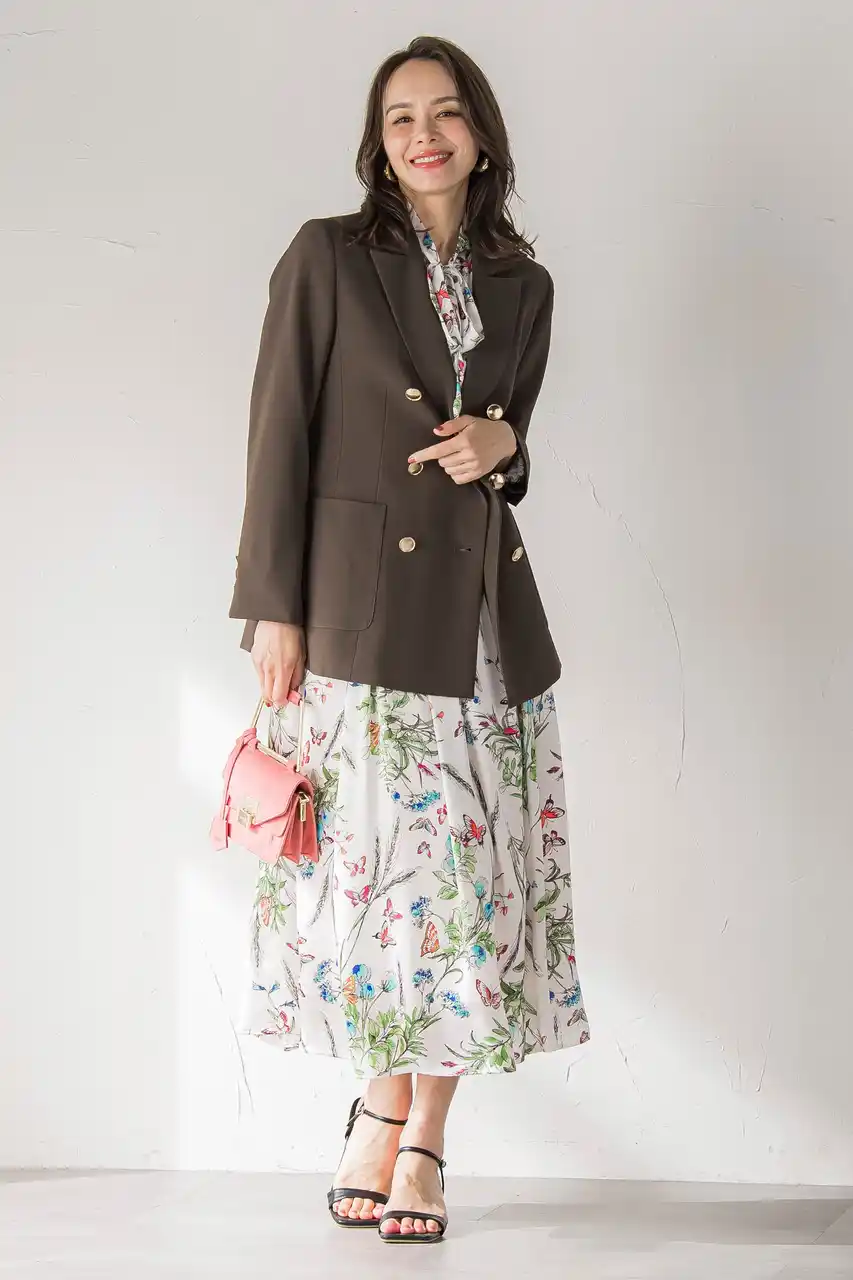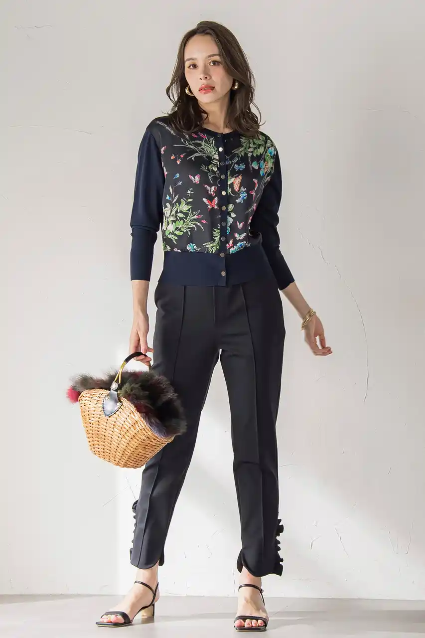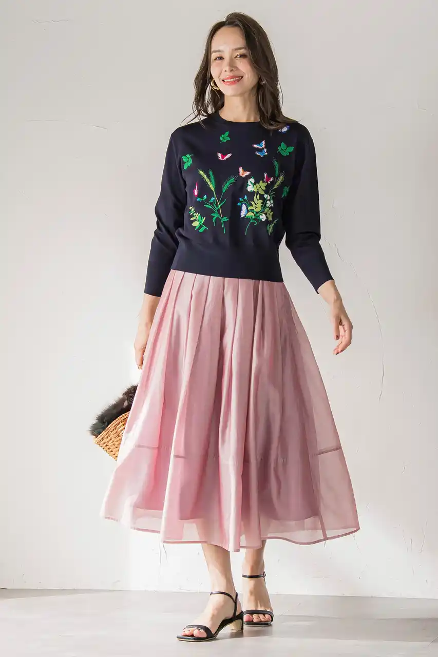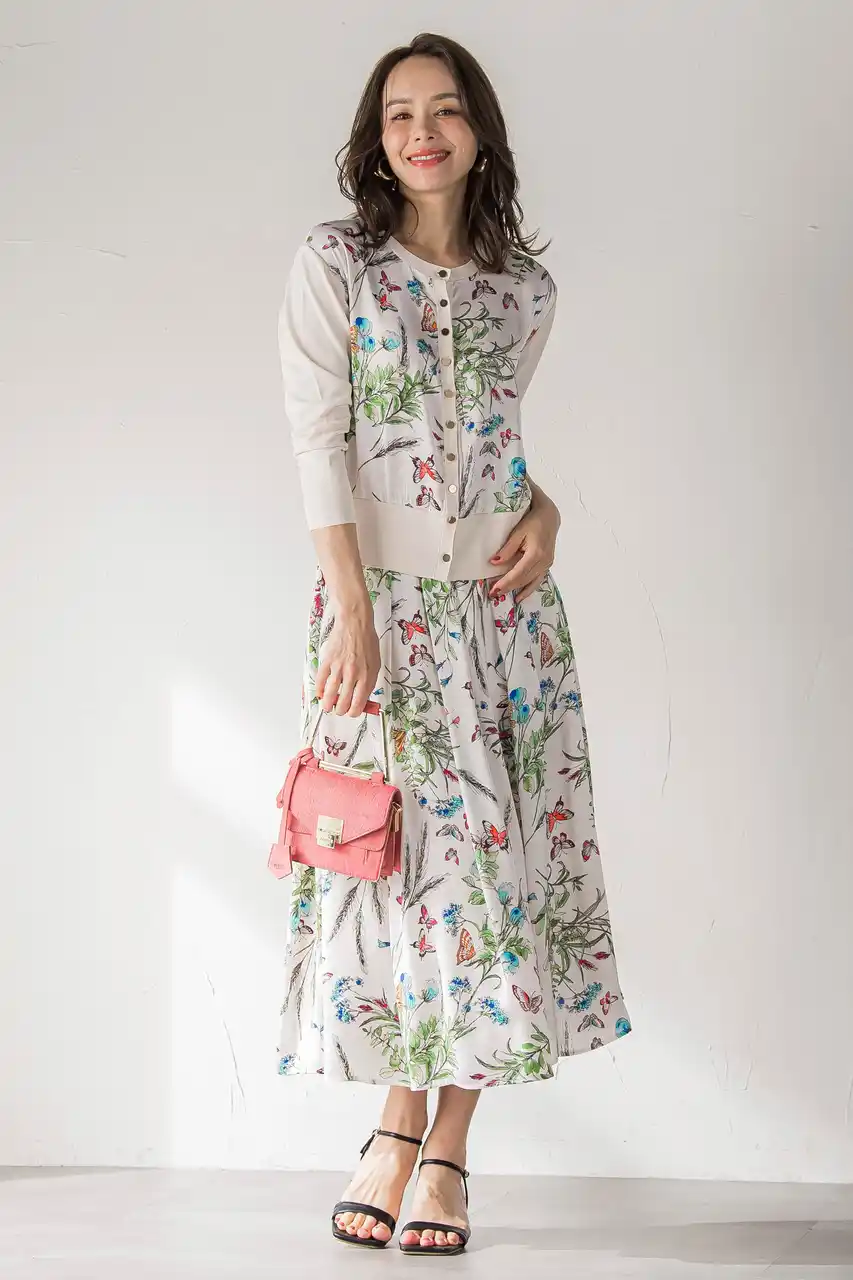 京都のアトリエでビアッジョブルーのためだけに、手書きで描かれた繊細なバラフライ柄が、 落ち着いた秋の装いにそっと華やぎを添えます。 大人の女性にふさわしい、アートのような一着です。 |