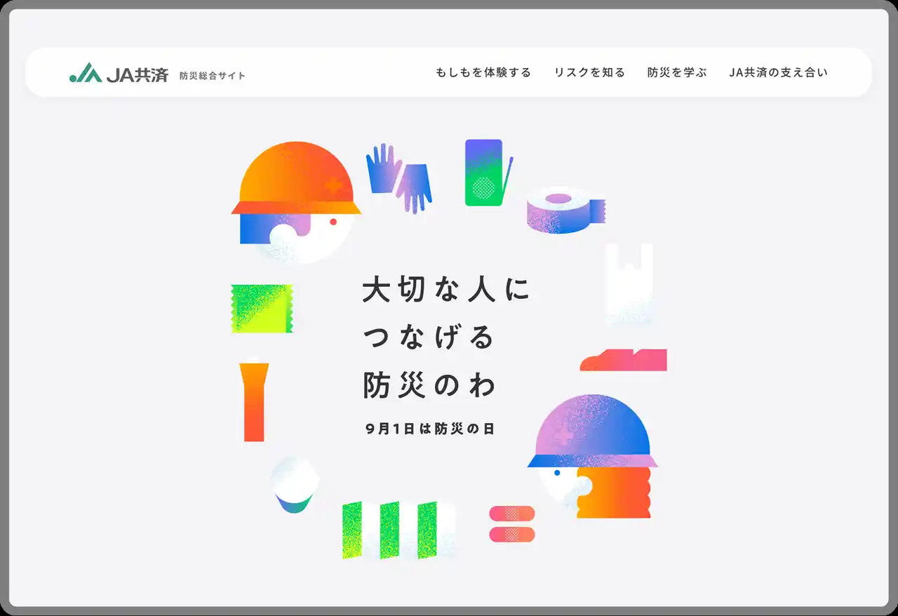 本サイトでは、『大切な人につなげる 防災のわ』というコンセプトのもと、自然災害への備えを“体験する”“知る”“学ぶ”という視点から、地域の災害リスクや防災の基礎知識をわかりやすく紹介するとともに、JA共済がこれまで取り組んできた“支え合い”の実績や想いを発信しています。 |