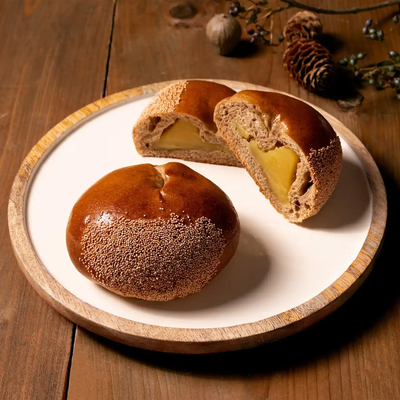 香り豊かなほうじ茶の生地に、粒入りの栗餡を包んだ秋限定のあんぱん。けしの実で栗に見立てて焼き上げました。 |