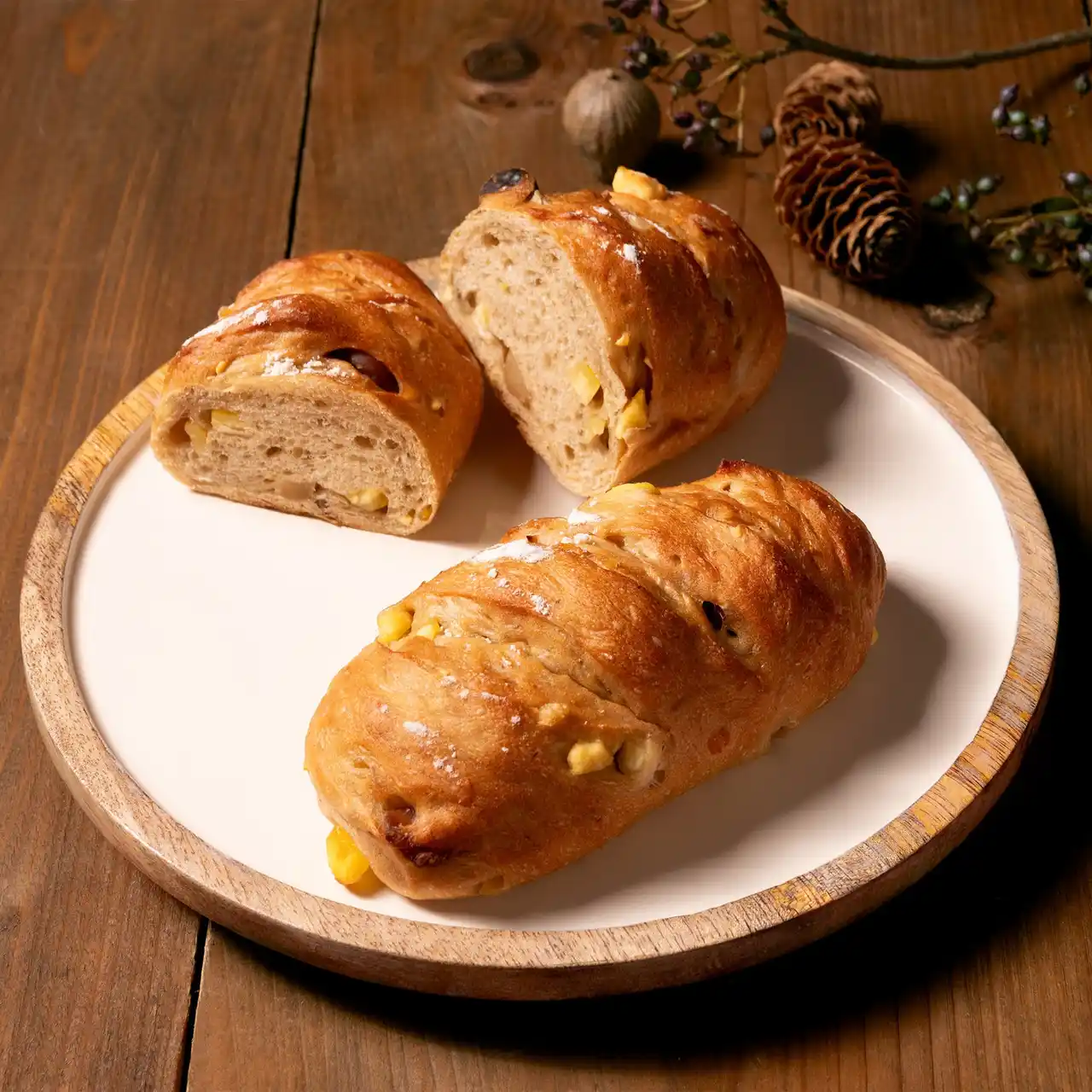 マロンペーストを合わせたカンパーニュに、栗の甘露煮とローストしたマカダミアナッツを合わせました。 |