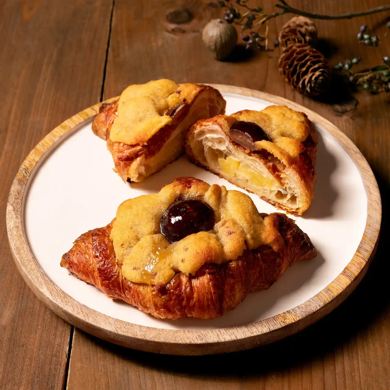粒入りの栗餡をサンドしたクロワッサンに、渋皮栗のアーモンドクリームを絞ってサクッと焼き上げました。 |