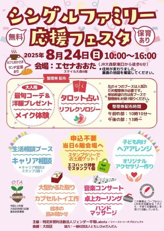 株式会社TSIホールディングス(本社:東京都港区赤坂、代表取締役社 CEO 下地 毅)は、大田区が後援し、特定非営利活動法人ジェンダー平等Labotaとファーストリーチプロジェクトが主催し、8月24日(日)に大田区大森の大田区立男女平等推進センター「エセナおおた」(スマイル大森6階)にて開催された「シングルファミリー応援フェスタ」に、児童養護施設を中心に慶祝支援活動を行う公益社団法人「いちご言祝ぎの杜」(東京都渋谷区渋谷 代表理事 染谷 裕之)を通じて当社の衣服と雑貨、約300点を提供いたしました。 |