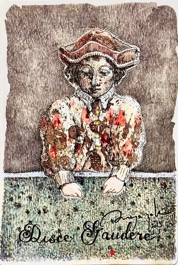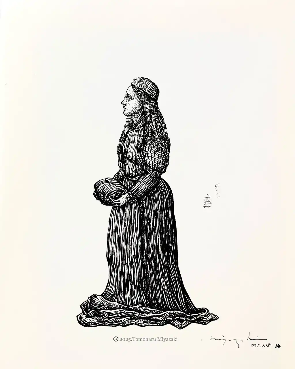 宮崎智晴氏はウィーン幻想派の古典絵画技法(テンペラ・油彩併用)を継承し、中世写本世界に見られる「細密水彩画」、ルネサンス期の筆記具を用いた「銀尖筆画」、蠱惑的な質感の「硝子絵」など、さまざまな技法や素材と向き合う仕事を続けています。 |