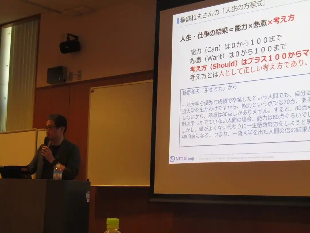 桜井氏は、京セラ株式会社やKDDI株式会社の創業者である稲盛和夫氏の「人生・仕事の結果=能力×熱意×考え方」という人生の方程式を紹介し、特に「考え方」の重要性を強調され、技術力だけでなく、正義・思いやり・利他の心を持つことが、企業人しての成長に不可欠であるとお話しされました。 |