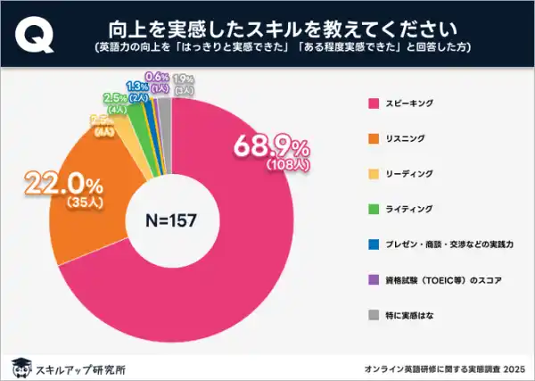 また、TOEICスコアの向上やライティング、リーディングといった他の応用スキルに関しても、実感率は軒並み低く、全体として実務での活用に直結する力の伸びを感じた人は限られていた。 |