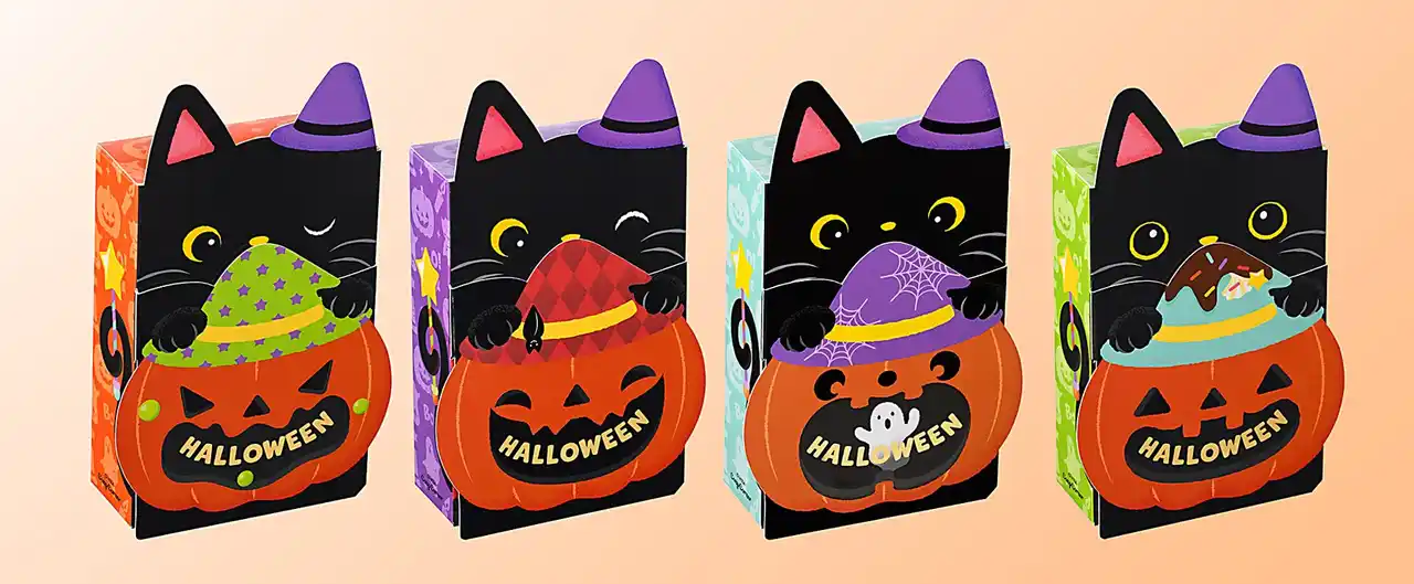 特長:ハロウィンのシンボル「黒ねこ」をモチーフにした立体的なボックスに、お花形のフルーリマドレーヌと、黒ねことかぼちゃをそれぞれプリントしたクッキーをアソートしました。フルーリマドレーヌ(バター、ショコラ)のフィルムは黒ねこやおばけがデザインされた4種類で、ランダムに入っています。ボックスデザインは、黒ねこの表情別に4種類。黒ねこが持っているかぼちゃのフタを開けると、かわいい表情が現れる仕掛け付きです。 |