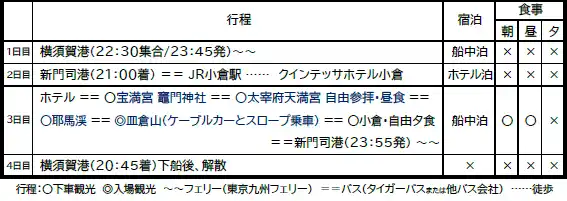 旅行代金に含まれるもの 東京九州フェリー往復乗船代(基本:ツーリストA)・宿泊代(1泊)・食事代(朝1回・昼1回)・バス代(3日目)・入浴代(湯布院山水館)・ 入場料(九重夢大吊橋)・消費税等諸税 |