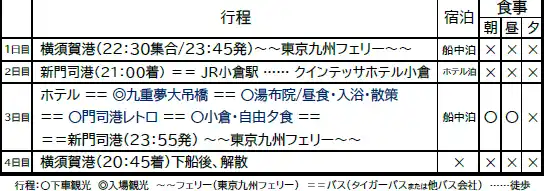 旅行代金に含まれるもの 東京九州フェリー往復乗船代(基本:ツーリストA)・宿泊代(1泊)・食事代(朝1回・昼1回)・バス代(3日目)・皿倉山ケーブルカー・スロ-プ代・消費税等諸税 |