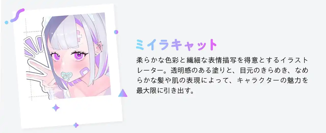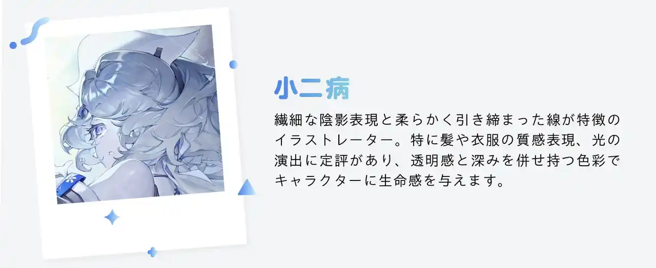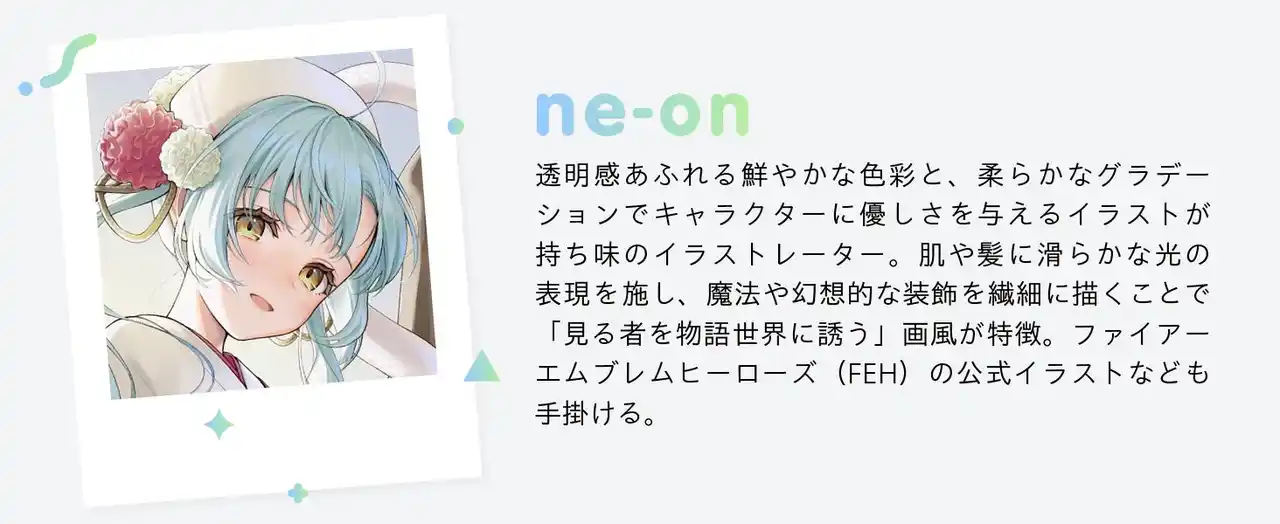 透明感あふれる鮮やかな色彩と、柔らかなグラデーションでキャラクターに優しさを与えるイラストが持ち味のイラストレーター。 |