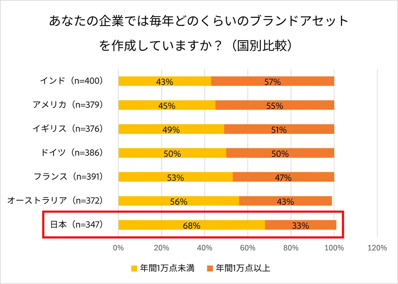実際に各国の企業が年間を通じてどれほどのブランドアセットを制作しているかを見たところ、年間1万点以上を制作している企業の割合には国ごとに大きな差が見られました。中でも、インド(57%)、米国(55%)では半数以上の企業がこの水準に達しているのに対し、日本は33%にとどまり、調査対象国の中で最も低い結果となりました(図2)。 |