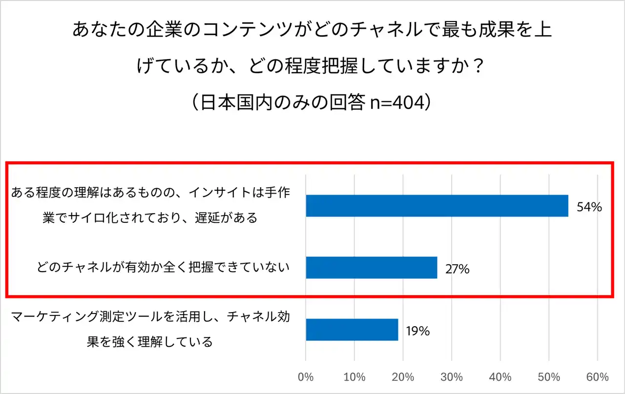 調査では、日本のマーケターが「自社のコンテンツがどのチャネルで最も成果を上げているか」について、十分に把握できていない現状も明らかになりました。調査結果によると、27%の日本のマーケターが「どのチャネルが有効か全く把握できていない」と回答(図5)。さらに、過半数を占める54%は「ある程度の理解はあるものの、インサイトは手作業でサイロ化されており、遅延がある」と認識しています(図5)。つまり、約8割の回答者がコンテンツのチャネル別のパフォーマンス把握に課題を感じていることがわかります。