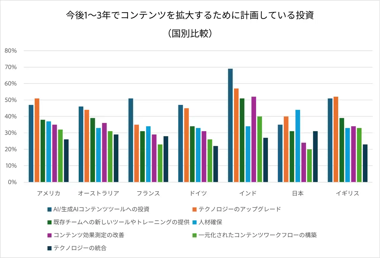 一方で、「コンテンツの効果測定の改善」や「一元化されたコンテンツワークフローの構築」といった運用面への投資については、それぞれ24%、20%にとどまり、日本以外の6か国では、それぞれ平均して36%、31%が投資を計画していることから差が明確になりました(図4)。このことから、日本企業では人材確保や先端テクノロジー導入への投資の関心が高まる一方で、制作したコンテンツの成果を可視化・分析し、運用の最適化につなげるための投資が後回しになっている実態がうかがえます。 |