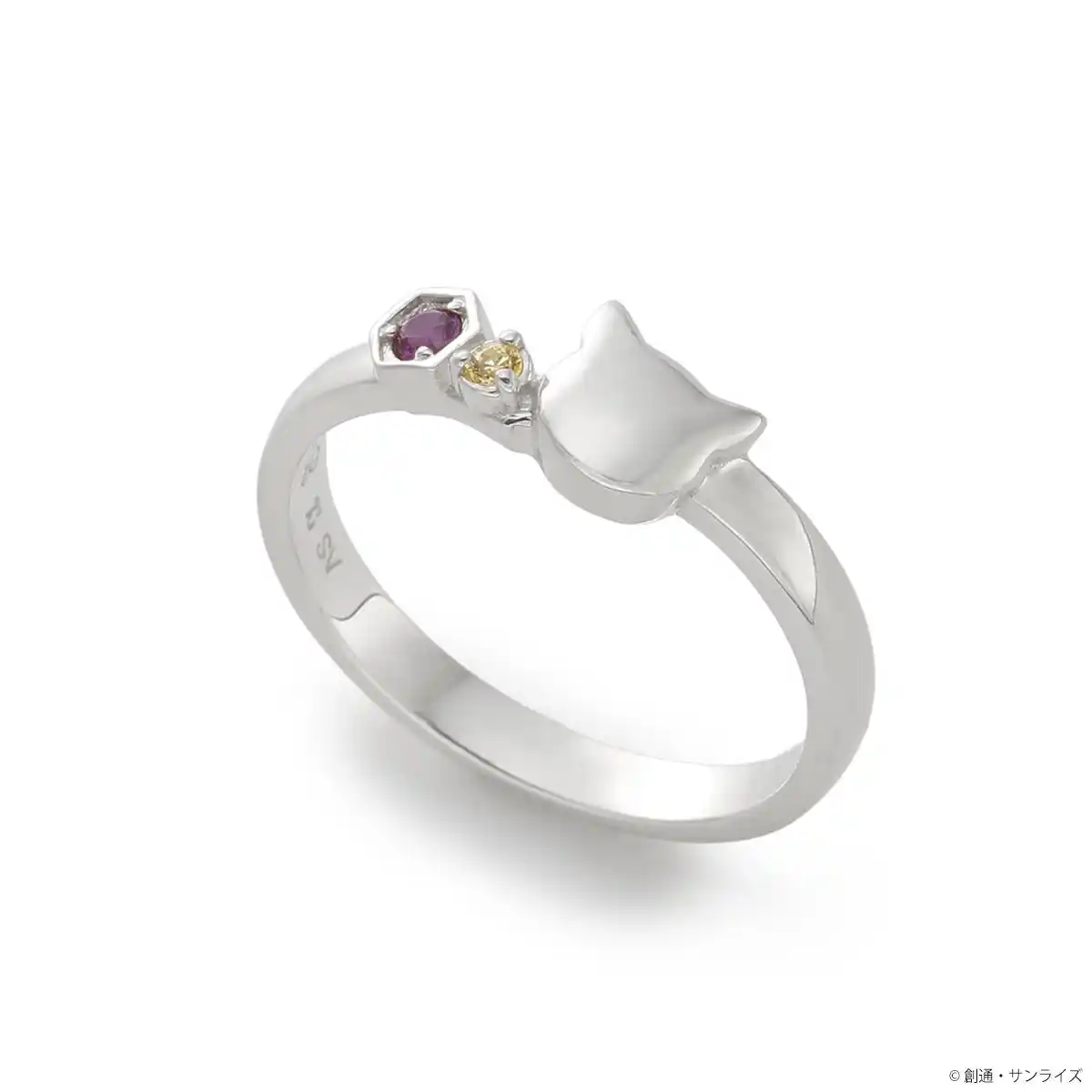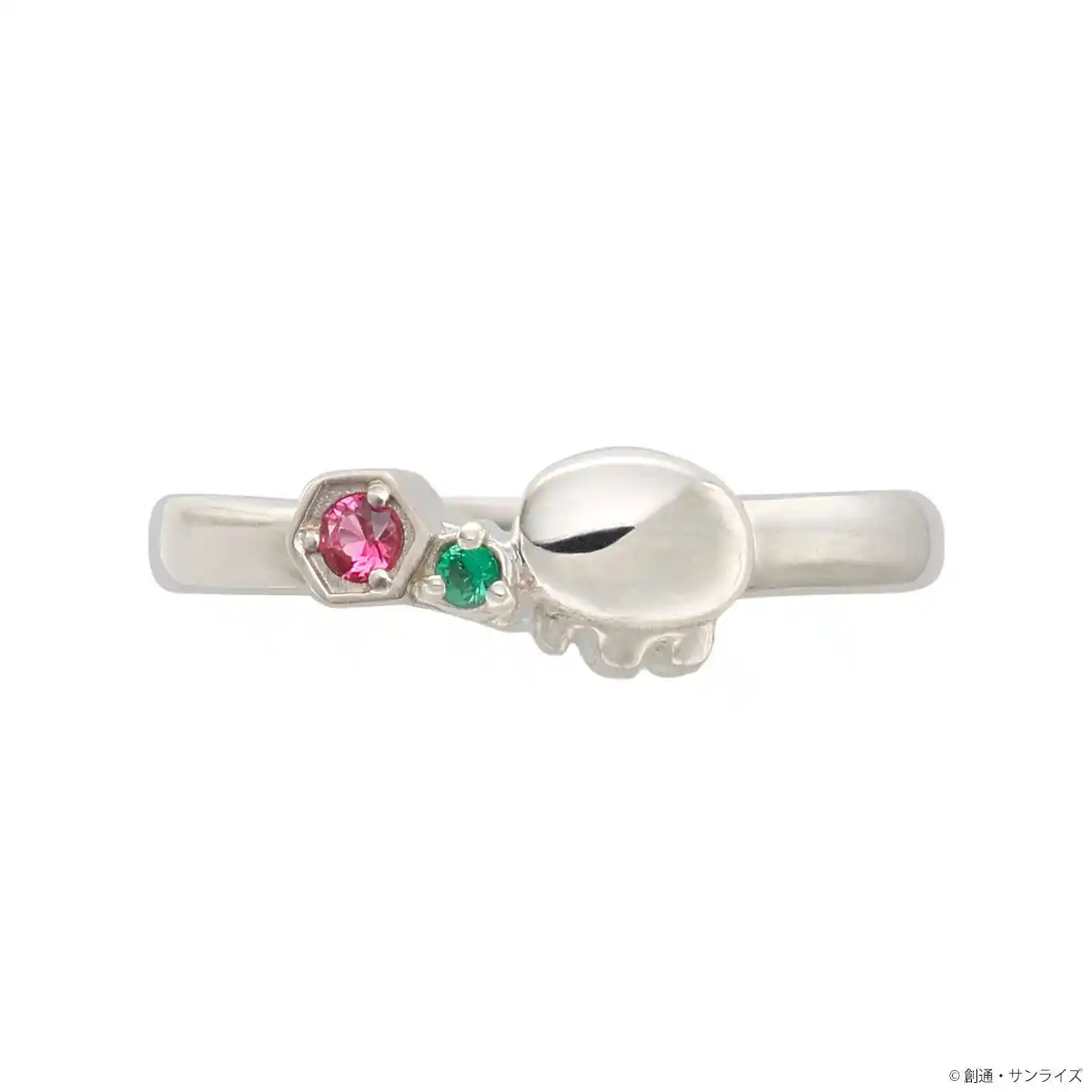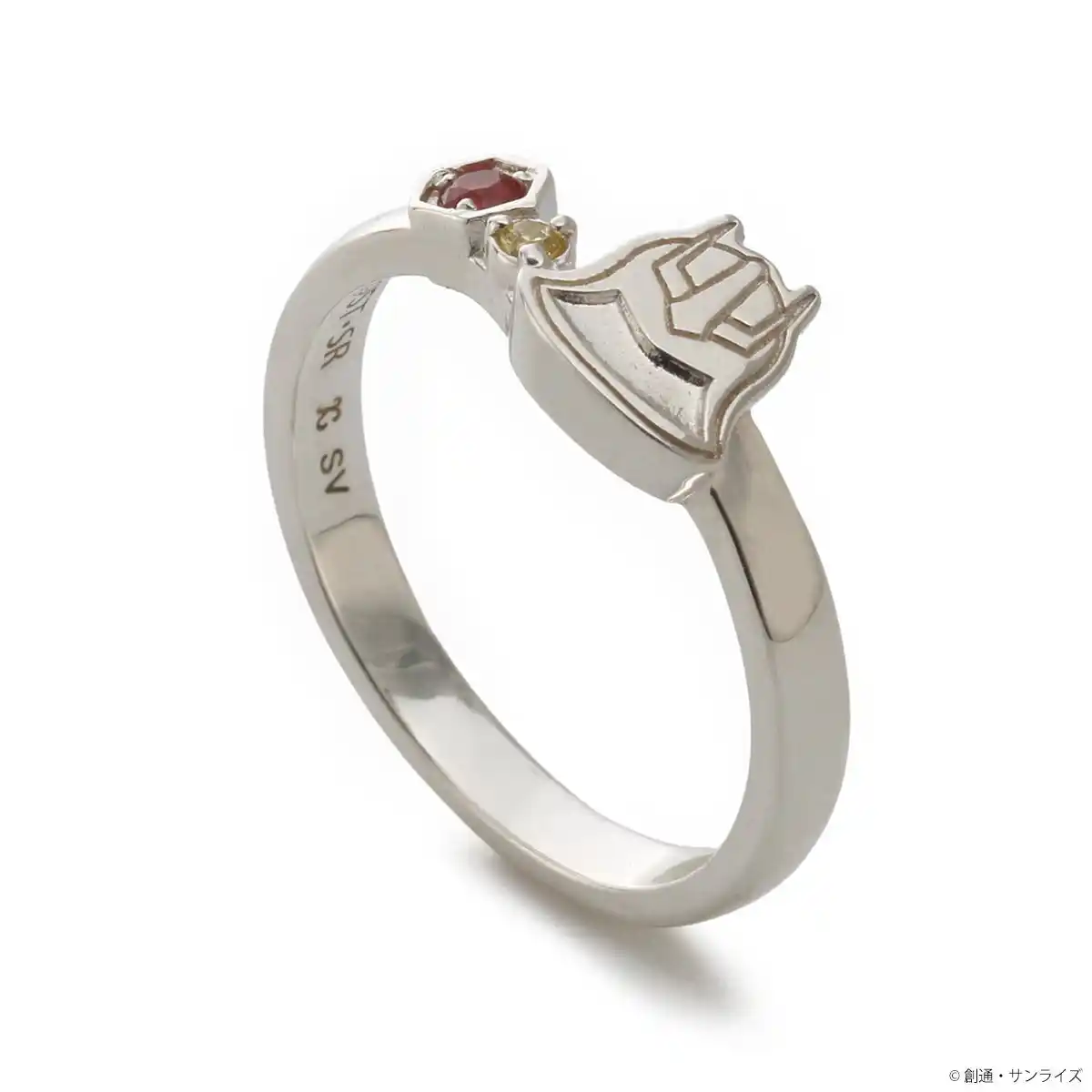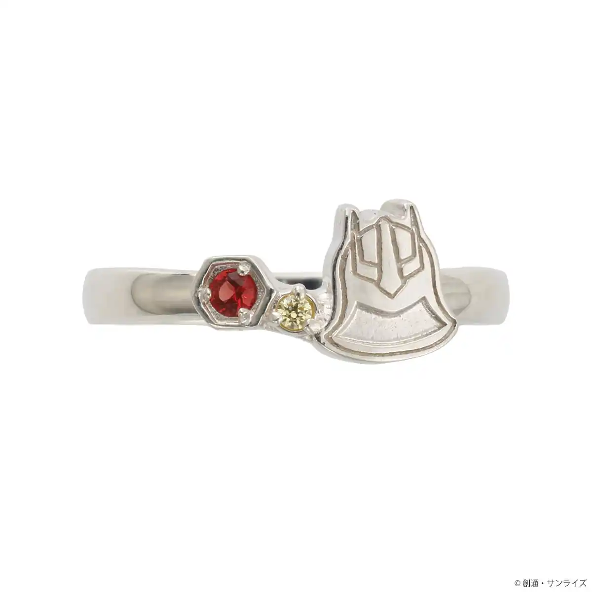 『機動戦士Gundam GQuuuuuuX』のアマテ・ユズリハ(マチュ)、ニャアン、シュウジ・イトウ、シャリア・ブルとシャア・アズナブルをイメージしたシルバーリングです。それぞれにクラゲ、ネコ、コンチ、中佐の胸章とヘルメットをモチーフに取り込んだゆるやかなV字ラインのデザインにイメージカラーストーンを2石セットしました。 |