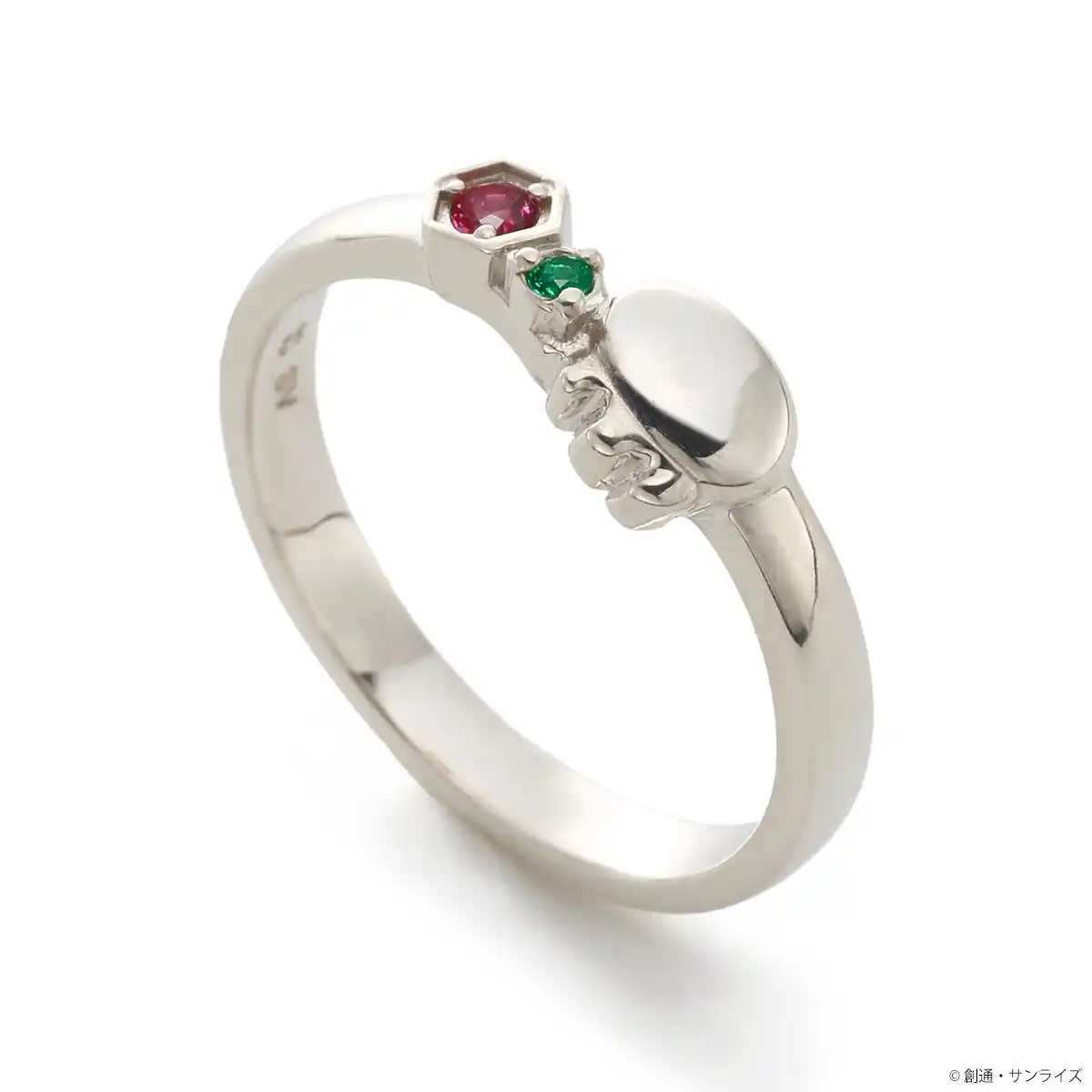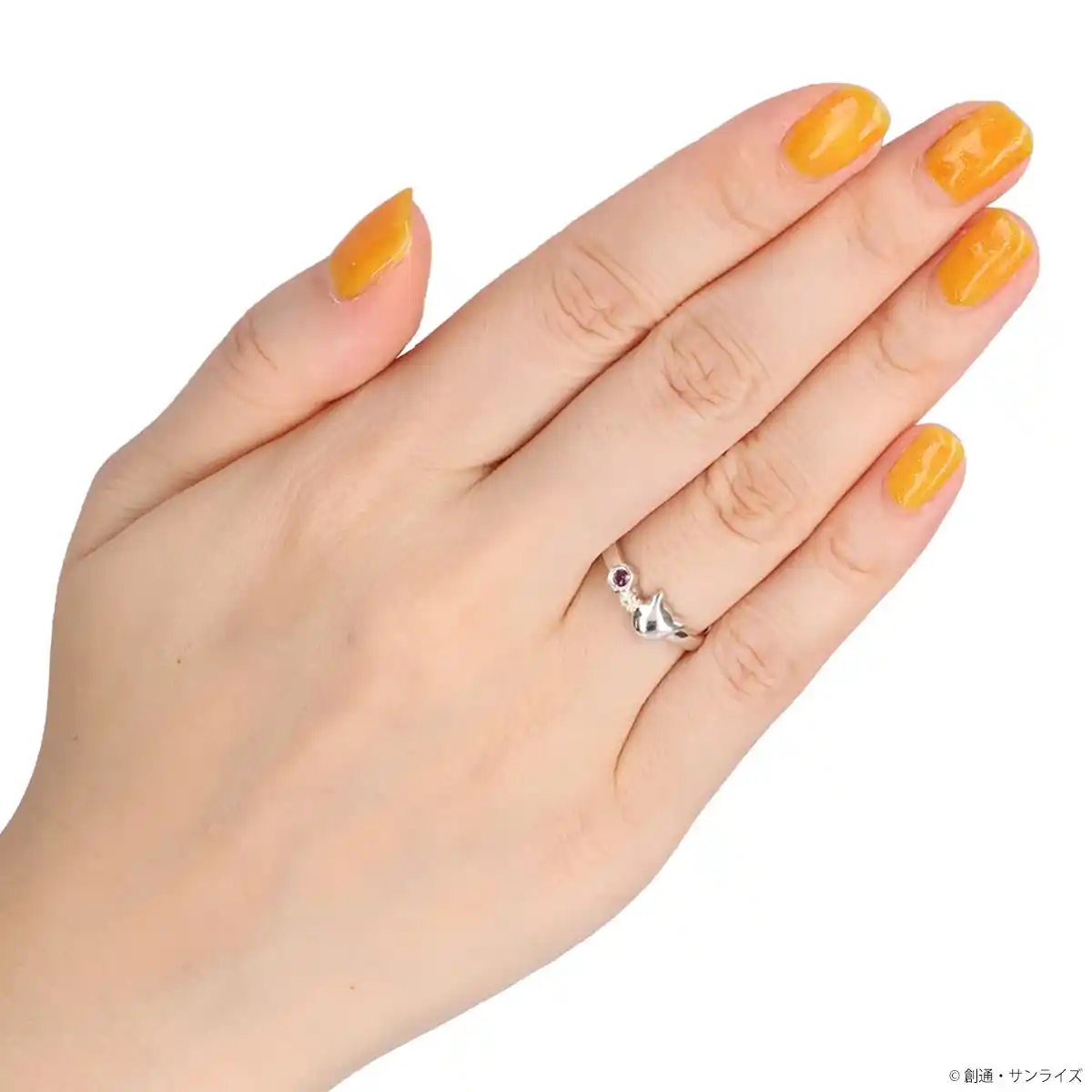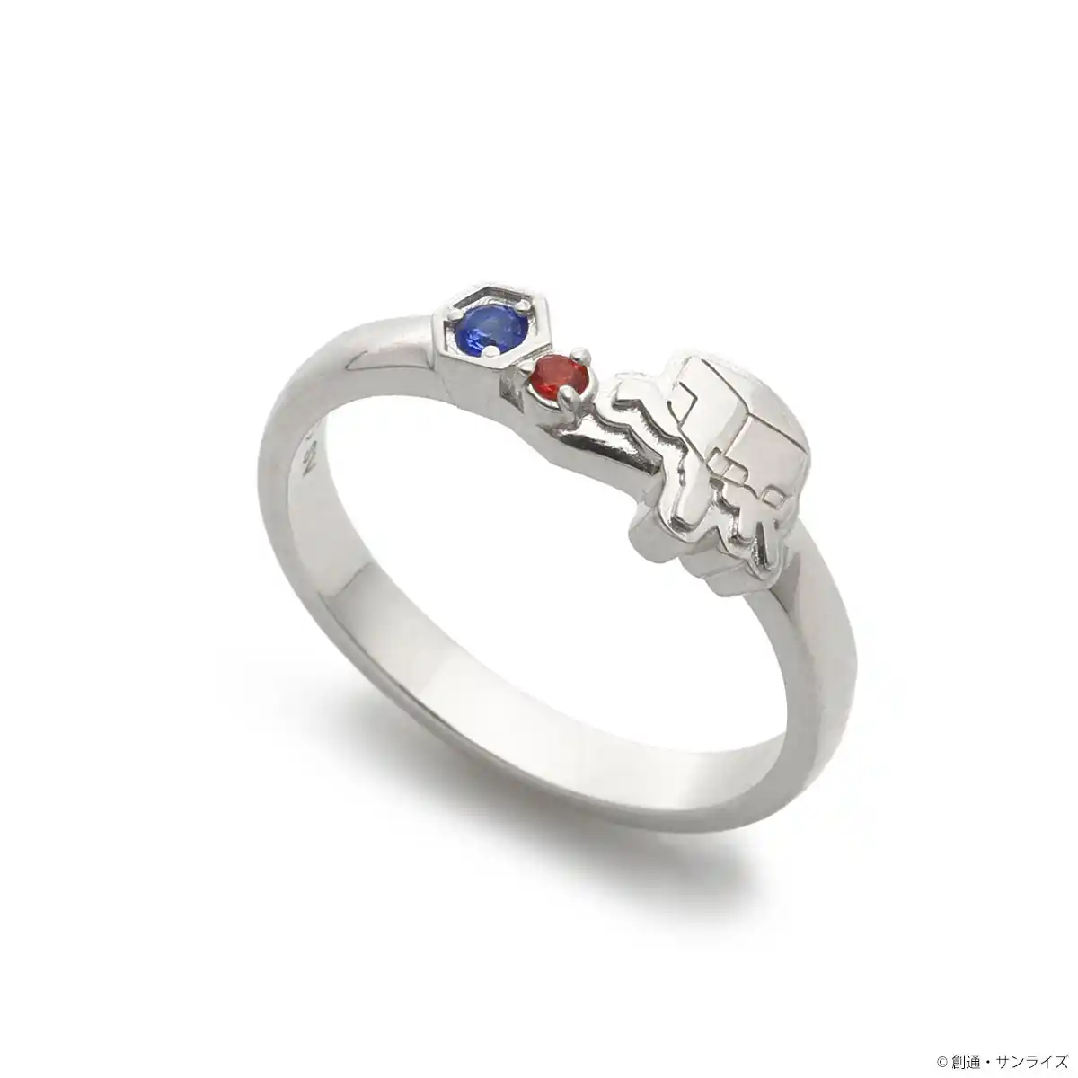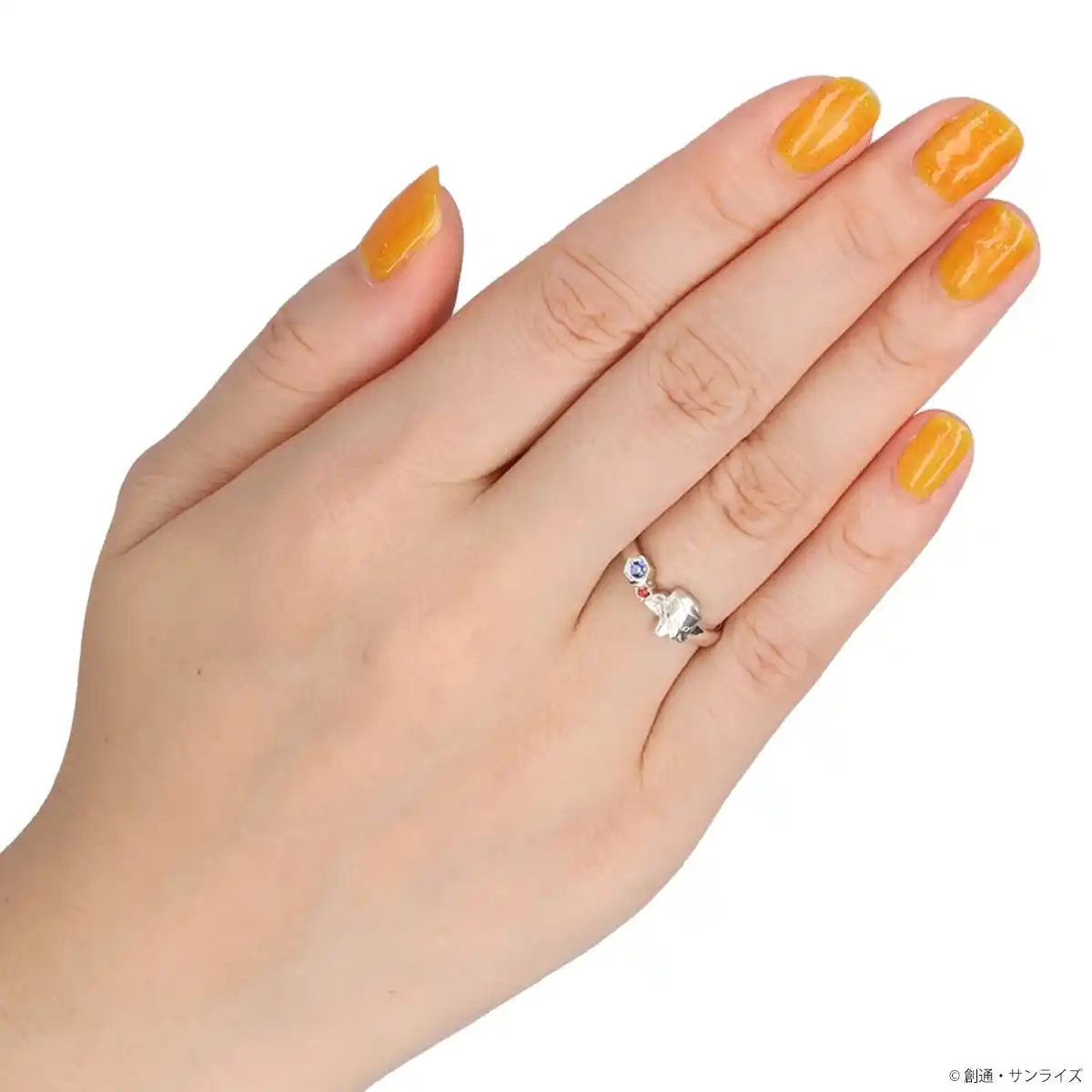 『機動戦士Gundam GQuuuuuuX』のアマテ・ユズリハ(マチュ)、ニャアン、シュウジ・イトウ、シャリア・ブルとシャア・アズナブルをイメージしたシルバーリングです。それぞれにクラゲ、ネコ、コンチ、中佐の胸章とヘルメットをモチーフに取り込んだゆるやかなV字ラインのデザインにイメージカラーストーンを2石セットしました。 |