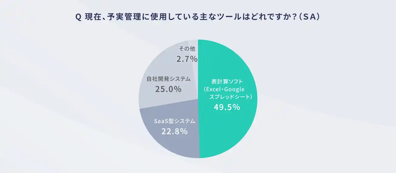その結果、予実管理に表計算ソフトを利用している人が49.5%に留まり、過半数がSaaSなどに移行していることがわかりました。また、現在も表計算ソフトを使用している人のうち8割が「より効率的な仕組みに変えたい」と回答しており、予実管理の分野において今後さらにDXが加速する可能性があることが明らかになりました。 |