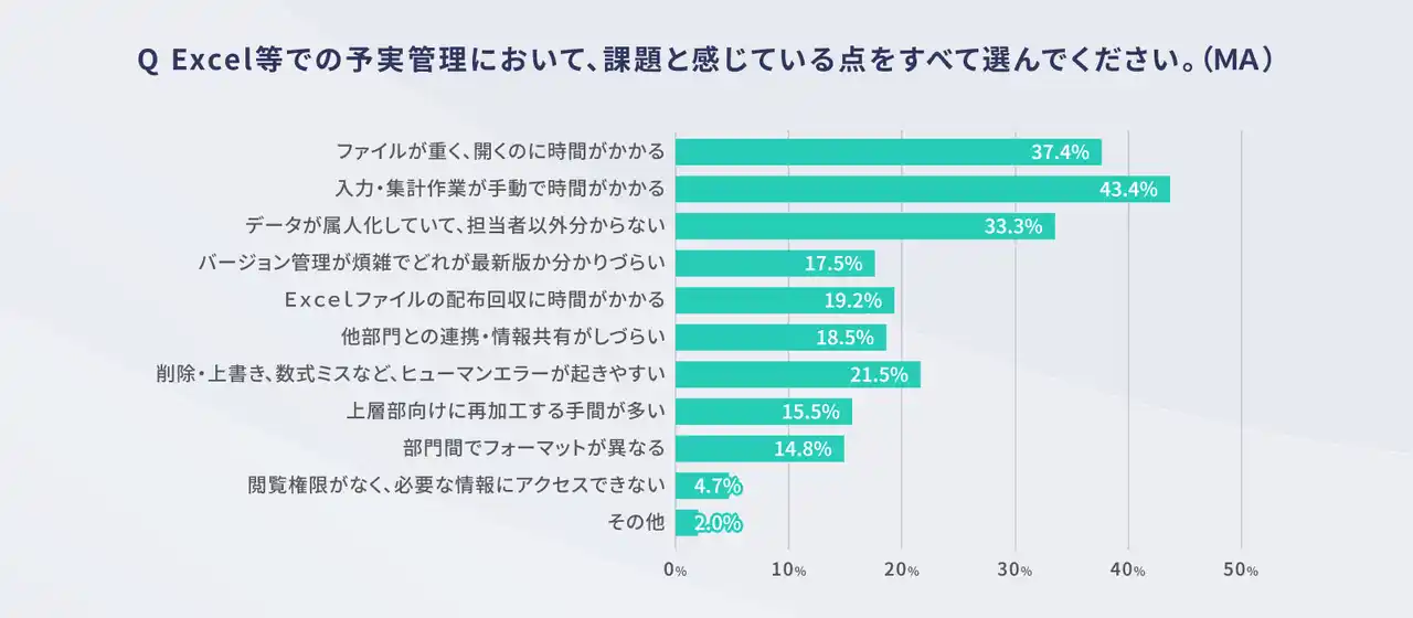 表計算ソフトを使って予実管理を行っている297名に対し、課題として感じている点を複数回答で尋ねたところ、最も多く挙がったのは「入力・集計作業が手動で時間がかかる」(43.4%)でした。次いで、「ファイルが重く、開くのに時間がかかる」(37.4%)、「データが属人化していて、担当者以外分からない」(33.3%)が続き、作業の煩雑さと人依存による運用リスクが、現場で強く認識されていることが分かりました。「削除・上書き、数式ミスなどヒューマンエラーが起きやすい」(21.5%)や、「ファイルの配布回収に時間がかかる」(19.2%)、「バージョン管理が煩雑でどれが最新版か分かりづらい」(17.5%)といった項目も多く、情報の一元化や管理の正確性に関する課題も広く共有されている実態が浮き彫りとなりました。 |