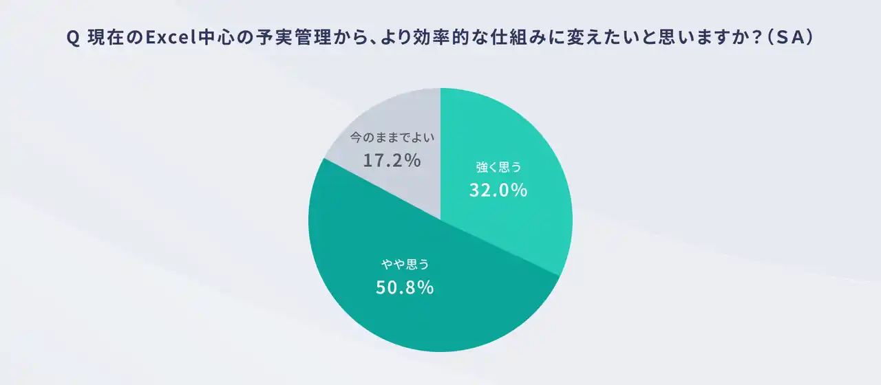 表計算ソフトを使って予実管理を行っている297名に対し、「より効率的な仕組みに変えたいと思うか」を尋ねたところ、「強く思う」(32.0%)と「やや思う」(50.8%)を合わせて、実に82.8%が“脱・表計算ソフト”への意向を持っていることが明らかになりました。一方で、「今のままでよい」と回答したのは17.2%にとどまっており、現状の運用に満足している層は少数派に留まります。 |