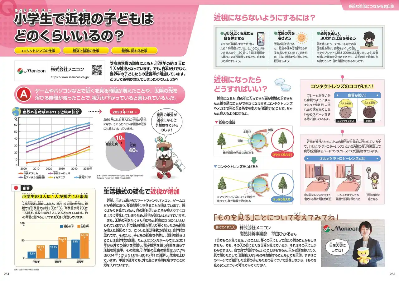 | 株式会社メニコン(本社:名古屋市中区葵三丁目21番19号、取締役兼代表執行役社長 CEO:川浦康嗣)は、朝日新聞社・朝日学生新聞社が発行する小中学生向けキャリア教育読本『おしごと年鑑2025』に今年で協賛開始から10周年を迎えました。 | |||