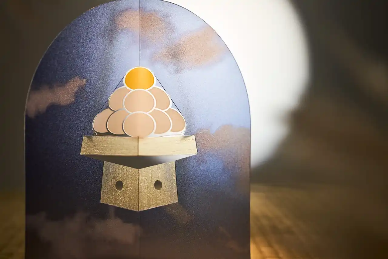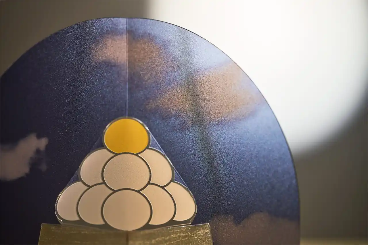 やはり折り方の検証に苦労しました。木台の端部の角度や大きさ、どれ一つでも崩れると成立しない絶妙なバランスで成り立っています。木台の折り目の角度を垂直にしてしまうと、お団子との距離が離れすぎてしまい、うまく載っているように見えず、やりすぎるとお団子の形状に影響が出てしまう為、最終的な見え方のバランスを取るのに苦労しました。 |