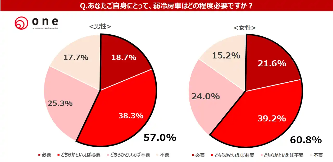 | 「弱冷房車はどの程度必要か」を聞いたところ、男性では「必要」「どちらかといえば必要」と答えた方が合計57.0%、女性では合計60.8%と、男女共に半数以上の方が弱冷房車を必要と感じているということが判明しました。一方で、弱冷房車不要派の割合は男性の方が高く、男女間での体感温度の差や通勤時の服装の違い、冷却グッズの使用率の差が、この意識差に影響しているのかもしれません。 | |||||||||||||