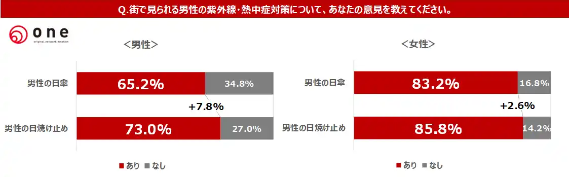 | 「男性の日傘・日焼け止めの使用」に対する考えを聞いたところ、日傘については「あり」と答えた男性が65.2%、女性が83.2%、日焼け止めについては「あり」と答えた男性が73.0%、女性が85.8%と、男女ともに男性の日傘・日焼け止めの使用に肯定的であることが明らかになりました。特に女性は8割以上が「あり」と支持しており、日常的に紫外線対策を行っている立場からすると、男性が思っている以上に日傘や日焼け止めを使用してほしいと思っているかもしれません。 | |||||||||||||