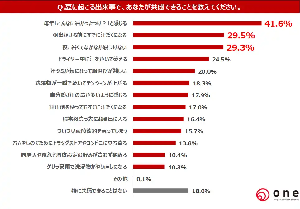 | 「夏に起こる出来事で共感できること」を聞いたところ、「毎年「こんなに暑かったっけ?」と感じる」が41.6%で最も高く、次いで「朝出かける前にすでに汗だくになる」が29.5%、「夜、暑くてなかなか寝つけない」が29.3%という結果になりました。年々厳しさを増す猛暑を肌で感じている方が多く、朝や夜といった本来は過ごしやすい時間帯でさえ暑さと戦っている様子がうかがえます。気温の上昇が、睡眠や外出準備など生活リズム全体にまで影響を及ぼしているようです。 | |||||||||||||
