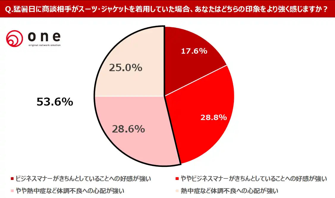 | ビジネスパーソンに、「猛暑日に商談相手がスーツ・ジャケットを着用していた場合どのような印象を受けるか」を聞いたところ、「熱中症など体調不良への心配が強い」「やや熱中症など体調不良への心配が強い」と答えた方が合計53.6%と、半数以上の方が相手の体調を気遣う傾向にあるということが明らかになりました。今後は過度なフォーマルさよりも健康に配慮した”スーツ・ジャケットNG”が新ビジネスマナーとして主流となるかもしれません。 | |||||||||||||