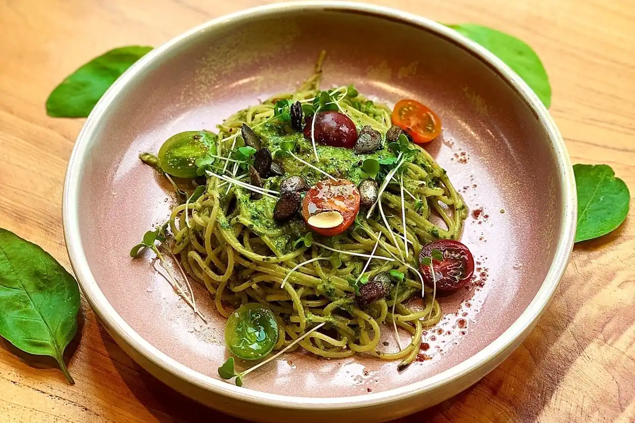 豆だけでできたグルテンフリーの「ZENBヌードル」に、爽やかなバジルの香りとナッツのコクが広がる特製グリーンソースをたっぷり絡めました。ニュートリショナルイースト(チーズのようなコクがある栄養酵母)の旨みやレモンの酸味がアクセントとなり、最後まで飽きずに楽しめる一皿です。仕上げにローストパンプキンシードの香ばしさ、ミニトマトの彩りと食感を添え、見た目も味も満足感たっぷり。暑い季節にもぴったりの、ヘルシーで食べごたえのあるパスタです。 |