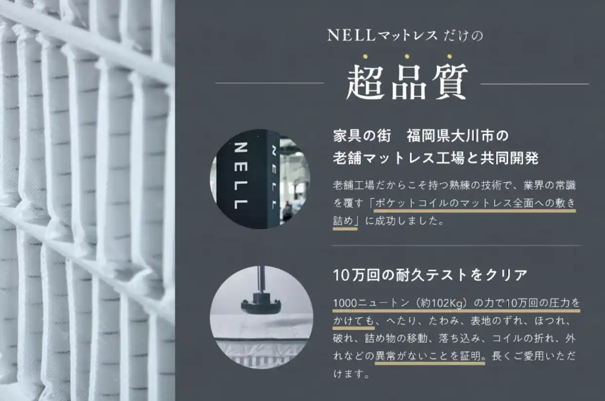「NELL マットレス」は、家具の街として知られる福岡県・大川市の老舗マットレス工場との共同開発で誕生しました。業界の常識を覆す、多数のポケットコイルをマットレス全体に敷き詰め、かつ10万回の耐久テストにも耐えうる「超品質」を実現しました。 |