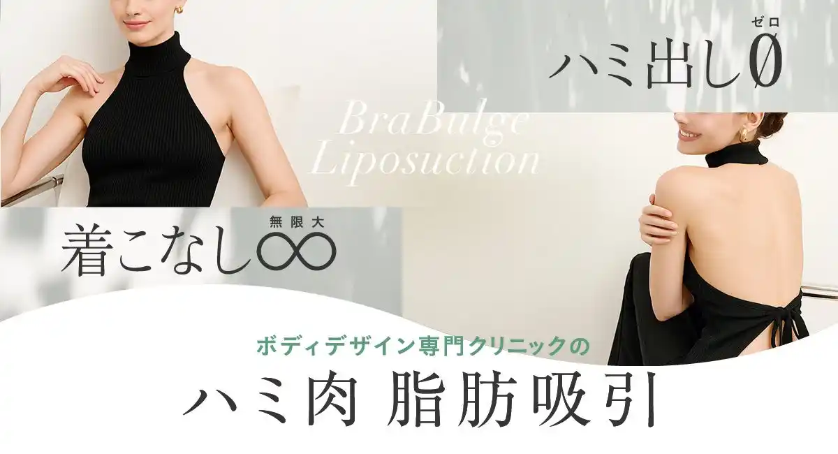 「ハミ肉脂肪吸引」は、特に腕を閉じたときにムニっとはみ出す脇肉が気になる方、ノースリーブやタンクトップをきれいに着こなしたい方、華奢に見せたい方におすすめの施術です。脇や背中のはみ肉を整えることで、腕が長く見え、胸の形がきれいに引き立ち、シルエット全体を華奢に見せる効果があります。結果として、ファッションをより自由に楽しめるようになるのも大きな魅力です。ただし、脂肪を取りすぎると胸が小さくなってしまったり、削げてしまったりするリスクもあります。ハミ肉でお悩みの方は、経験豊富な脂肪吸引専門クリニックの私たちにぜひお任せください。 |