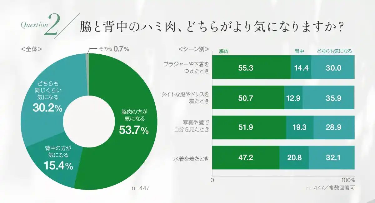 一方で、注目したいのは「背中の方が気になる」との回答が15.4%、「どちらも同じくらい気になる」が30.2%あった点です。背中は普段自分では見えにくい部位でありながら、実際には3人に1人以上が“背中のハミ肉も気になる”と答えていることになります。つまり「脇は自分でも見えやすいので気になるもの。しかし見えづらい背中も、意外と多くの人にとって悩みになっている」という事実が浮き彫りになりました。 |