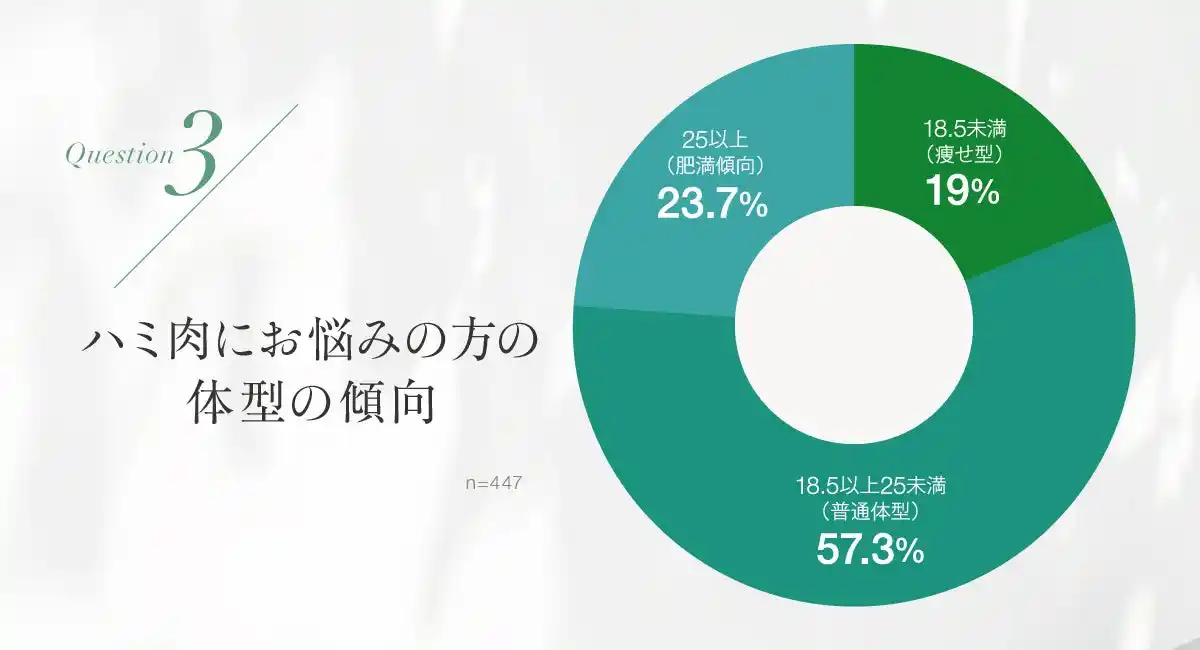 注目すべきは、「肥満傾向にあるわけではなくても、ハミ肉が気になる人が多い」という点です。実際に最も多かったのは普通体型の女性(57.3%)で、次いで肥満傾向(23.7%)、さらに痩せ型(BMI18.5未満)でも19.0%が「ハミ肉が気になる」と回答しています。このことから、ハミ肉は体重や体型だけで決まるものではなく、普通体型や痩せ型の人も悩みを抱えていることがわかります。つまり、ダイエットや全身運動といったアプローチで痩せても、ハミ肉が解消するとは限らないということです。 |