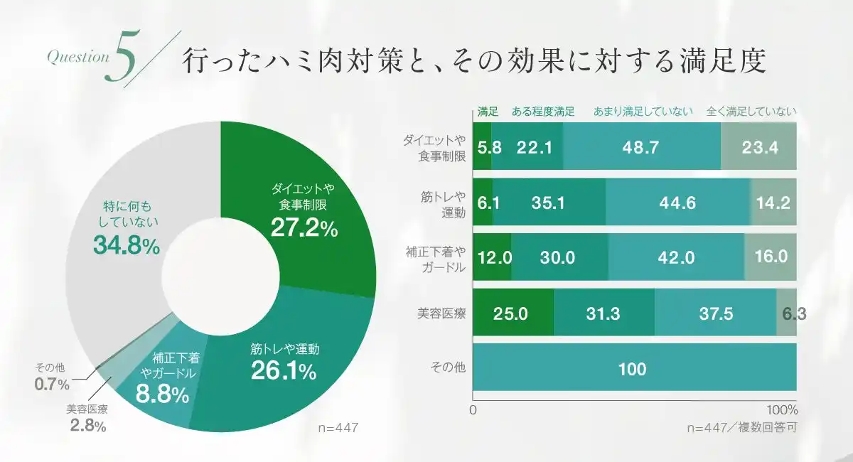 ハミ肉対策として多く行われているのは「ダイエットや食事制限」(34.4%)、「筋トレや運動」(33.1%)、「補正下着やガードル」(11.2%)。しかし、その満足度は低く、 |