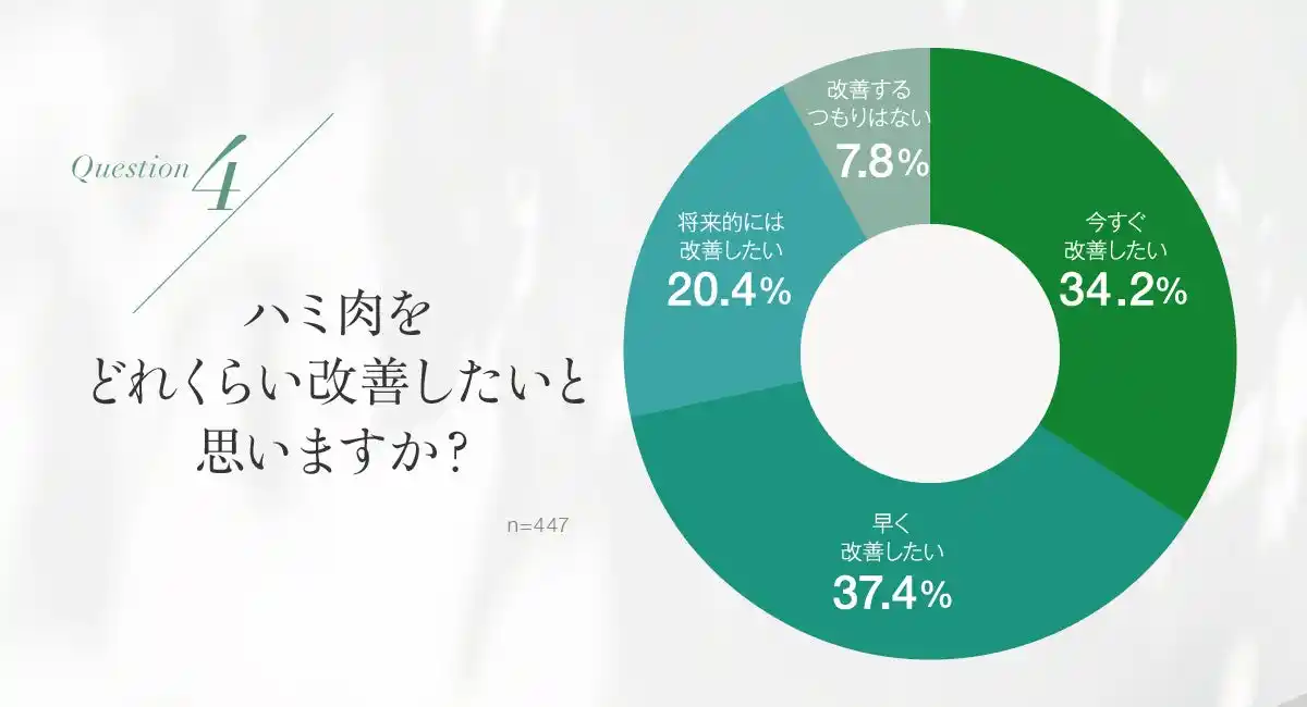 「はみ出し肉の気になるレベルは?」という質問に対し、「今すぐ改善したい」(34.2%)、「早く改善したい」(37.3%)を合わせると、7割以上が切実に改善を希望していることが明らかになりました。 |