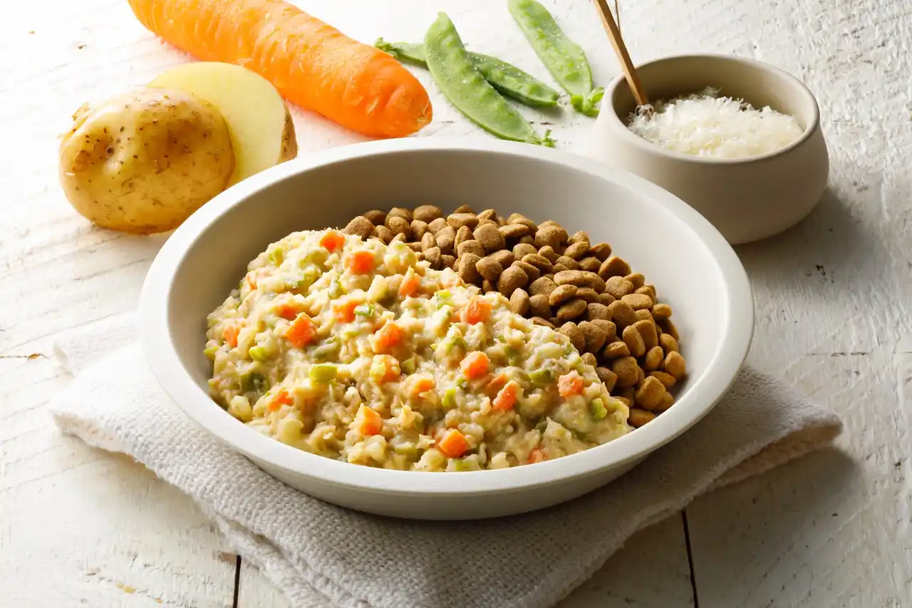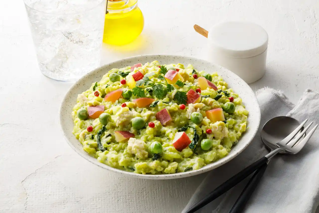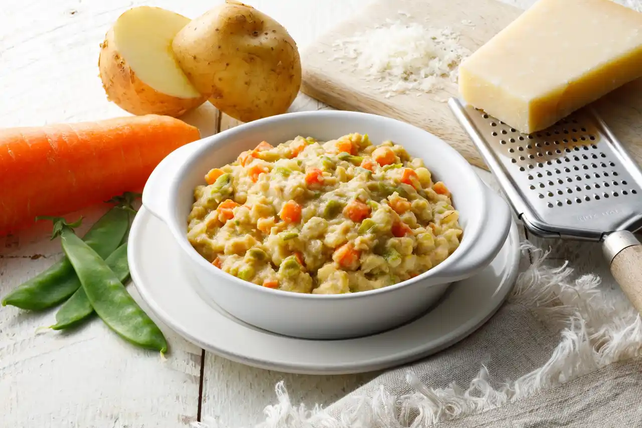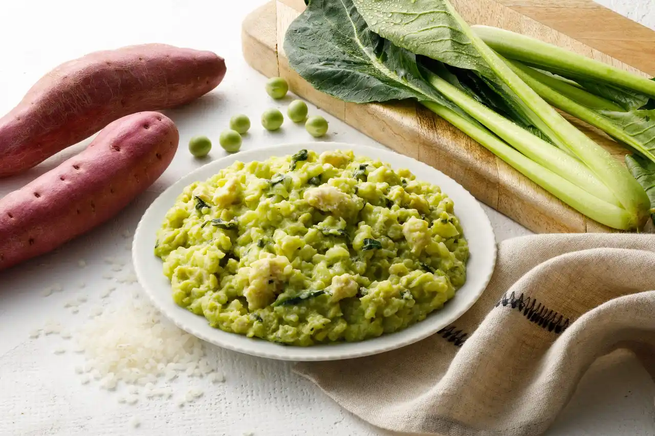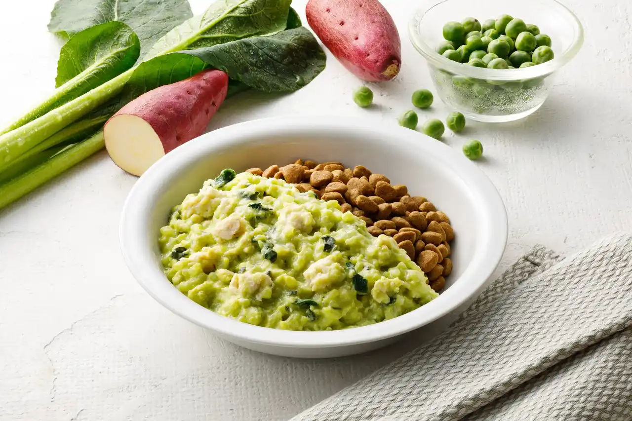 色鮮やかなグリンピースと甘味のあるさつまいも、わんちゃんに人気の鶏むね肉をリゾット風に仕上げました。まろやかな味わいです。 |