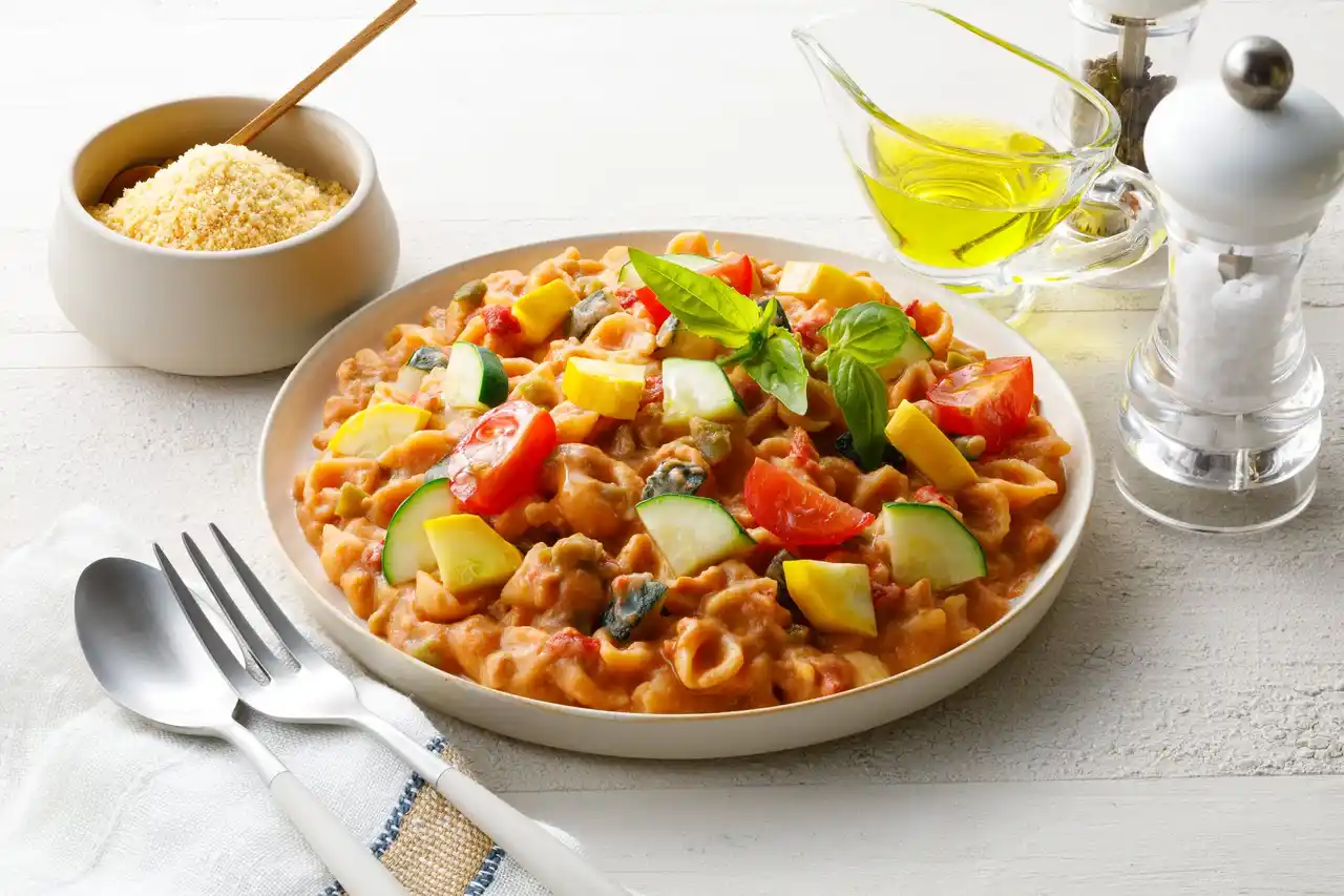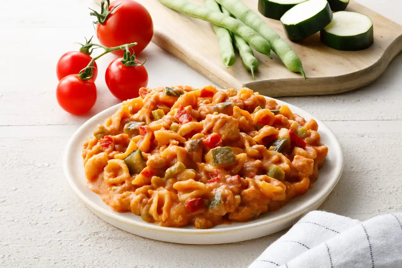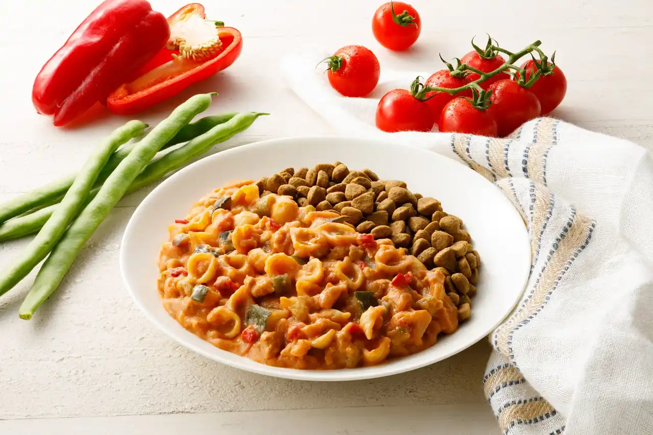 パプリカやズッキーニなどの6種の野菜と豚肉を使用し、トマトベースのパスタに仕上げました。ショートパスタを使用することでわんちゃんも人も食べやすくなっています。 |