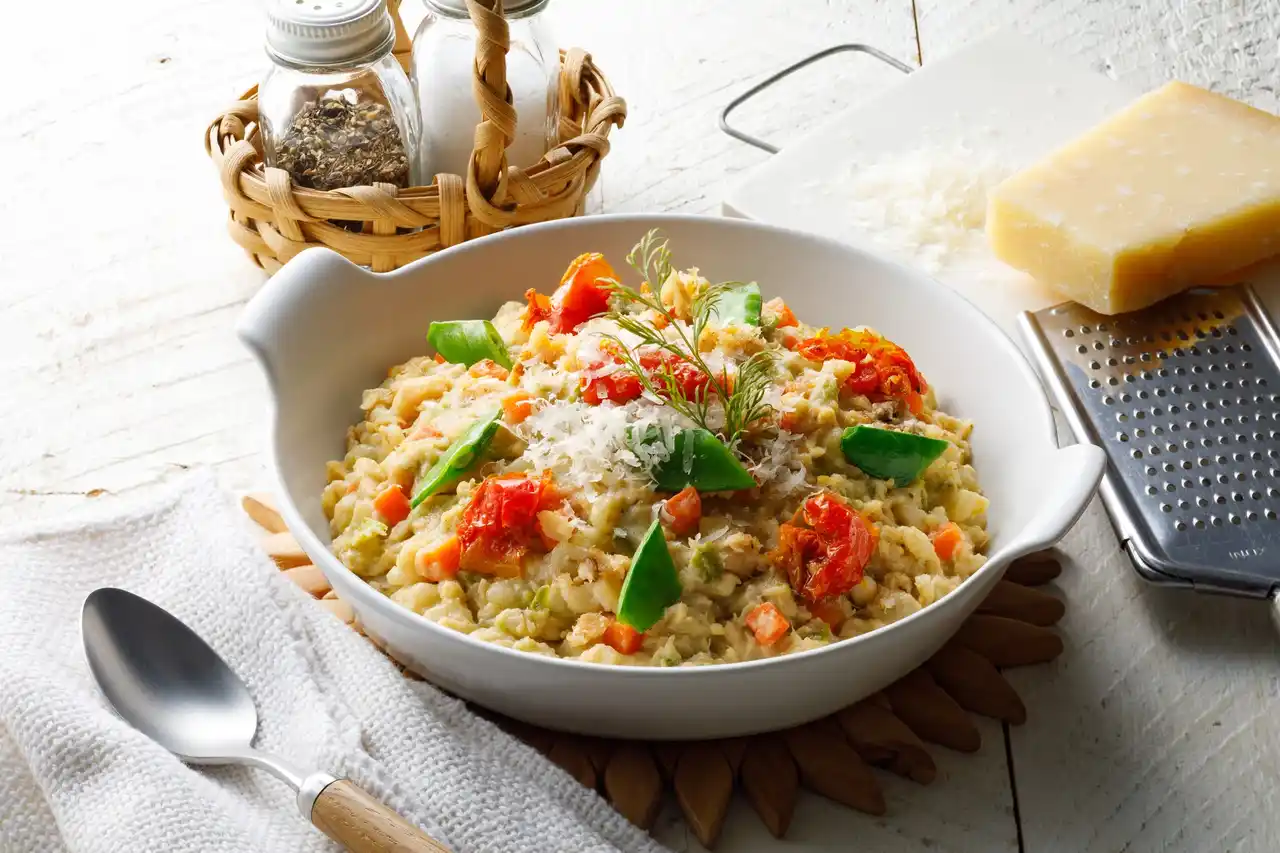 鯛と彩り野菜を、香り高いチーズや鰹節と合わせて大麦リゾット風にしました。お魚好きにはたまらない一品です。 |