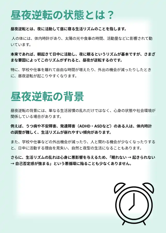 また、昼夜逆転は、生活リズムの乱れだけでなく、心身の不調につながることもあります。 |