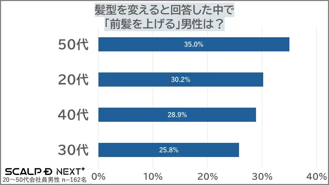 特に注目すべきは「前髪を上げる」スタイルの年代別傾向です。髪型を変える男性の中で「前髪を上げる」と回答した割合は、意外にも50代が35.0%で最多となり、続いて20代30.2%、40代28.9%、30代25.8%の順でした。年齢を重ねるほど、額を見せるスタイルでビジネスにおける信頼感や威厳を演出している実態があるのではないでしょうか。 |