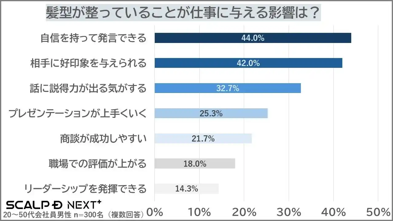 髪型がビジネスにおいて重要な印象要素だと思うかという質問に対し、実に78.0%(234人)が「重要だと思う」と回答。さらに、髪型が整っていることで仕事に与える具体的な効果として、最も多かったのは「自信を持って発言できる」で44.0%、続いて「相手に好印象を与えられる」(42.0%)という結果となりました。 |