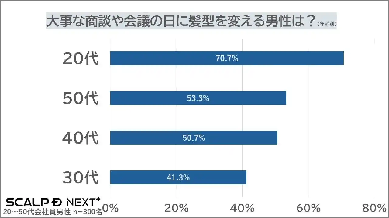 20代では、大事な商談や会議がある日に髪型のセットを変える人の割合が他世代を大きく上回り、約7割が髪型を変えていることが判明しました。 |