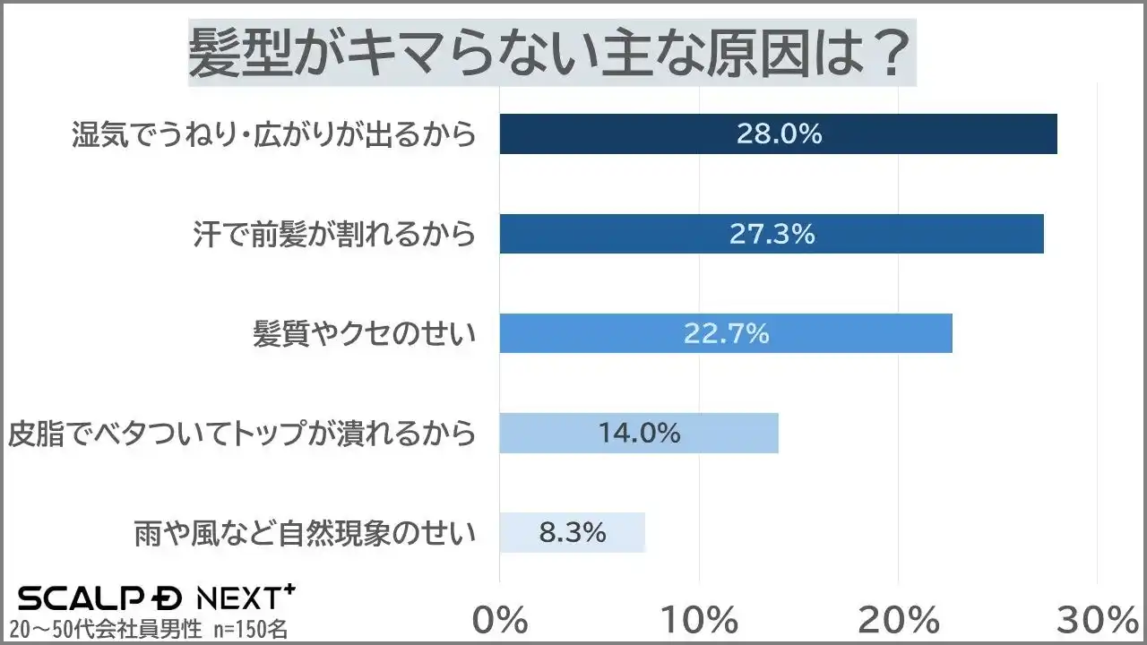 「湿気でうねる・広がる」(28.0%)、「汗で前髪が割れる」(27.3%)が2大要因に! |