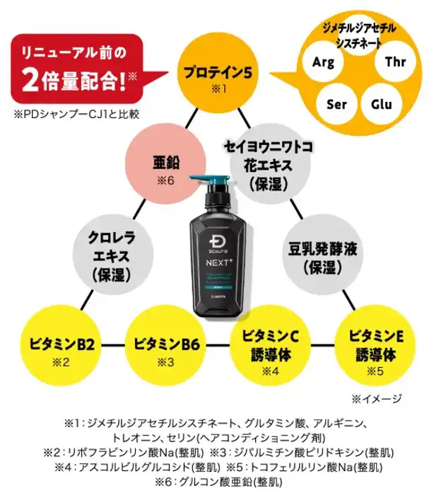 髪を構成するアミノ酸上位5種を独自バランスで配合した「プロテイン5エキス※9」で髪を保湿・補修。また、8種の厳選成分が地肌のコンディションを整え、スタイリングしやすいベースへ。 |